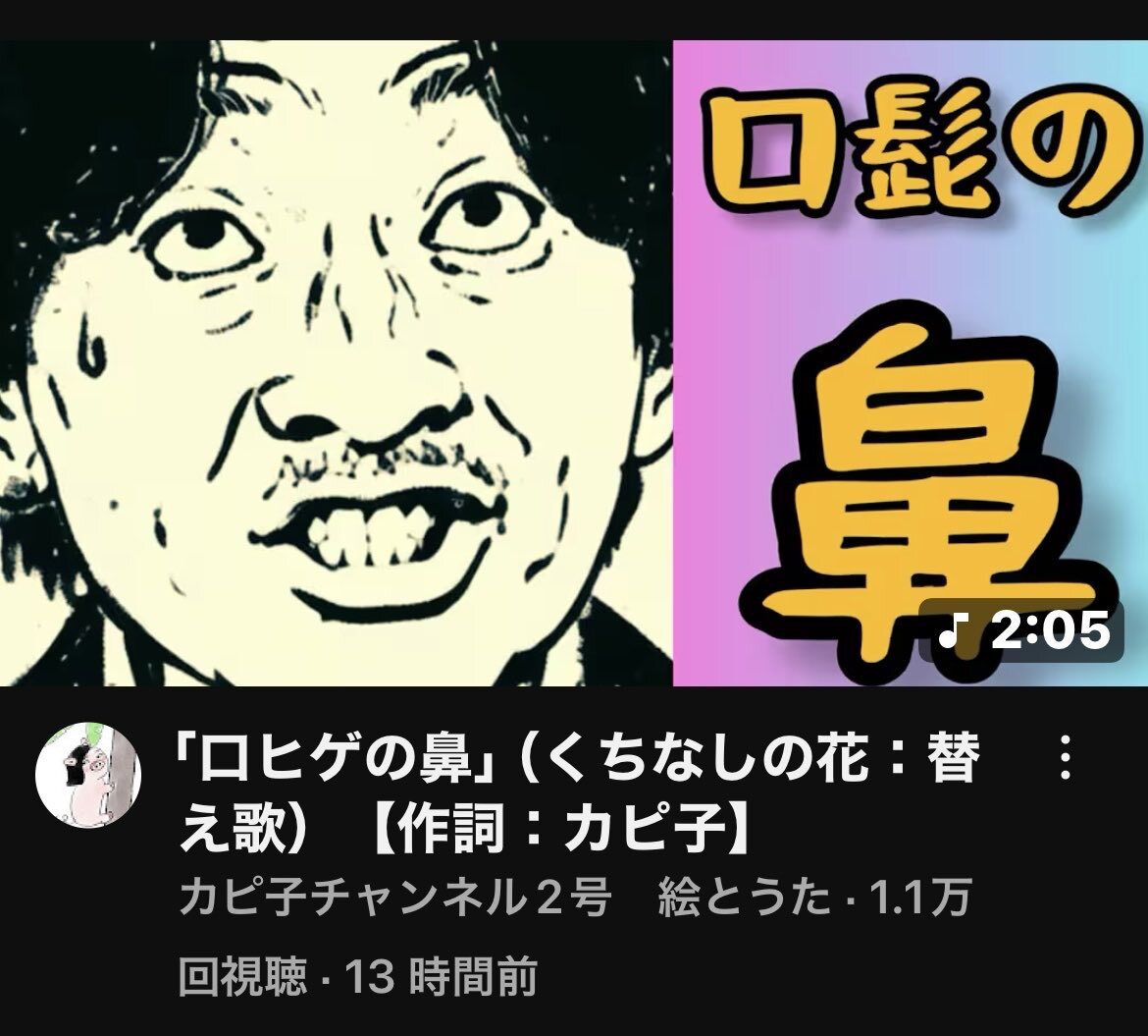 10月19日(日) カピ子さん(@sirotubaki11111 )が YouTubeに素敵な歌を投稿されています ↓↓↓ youtu.be/IRDfAx40ztI?si… 「口ひげの鼻」 (くちなしの花 : 替え歌) 【作詞 : カピ子さん】 pic.x.com/V3wqxD9On5