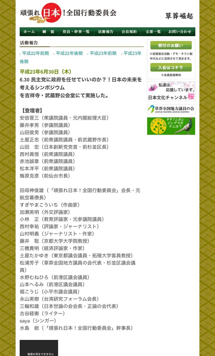 ”頑張れ日本!全国行動委員会” (2011.6.30) ganbare-nippon.net/23_1.html 【登壇者 (一部抜粋)】安倍晋三, 松本洋平, 田母神俊雄, すぎやまこういち, 加瀬英明, 藤井聡, 三橋貴明, 古谷経衡, saya, 水島総 (委員会幹事長) ... 当時は民主党政権時で松本洋平氏は落選浪人中 pic.x.com/a7V8mYeLtb