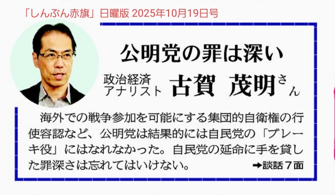 ◎赤旗日曜版10月19日号は 自公連立政権が崩壊!理由は「政治とカネ」。日曜版の裏金スクープが悪政連合をついに追い込みました。「自民党政治を終わらせる時」=古賀茂明さん、「自民に助け舟を出したのが公明党」=神戸学院大教授の上脇博之さん。連立崩壊を深掘りし、自民を支え続けた公明の罪を pic.x.com/ynwl5BcNBz