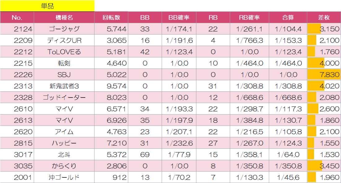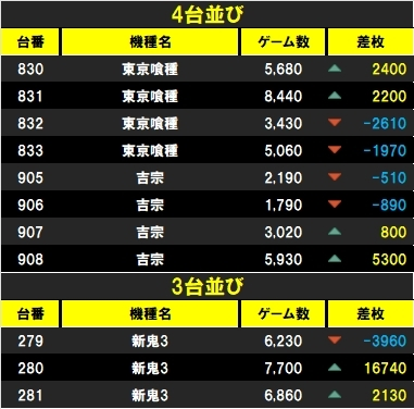 🧊ToLOVEるダークネス(4台) 🥇13番台+4750枚 🥈11番台+120枚 🧊甲鉄城のカバネリ(4台) 🥇188番台+3050枚 🥈186番台+90枚 🧊ハナハナホウオウ-30(4台) 🥇86番台+760枚 🥈88番台 -30枚 🧊L吉宗(3台) 🥇93番台+530枚 🥈95番台 -280枚 pic.x.com/mhUfO4glqY