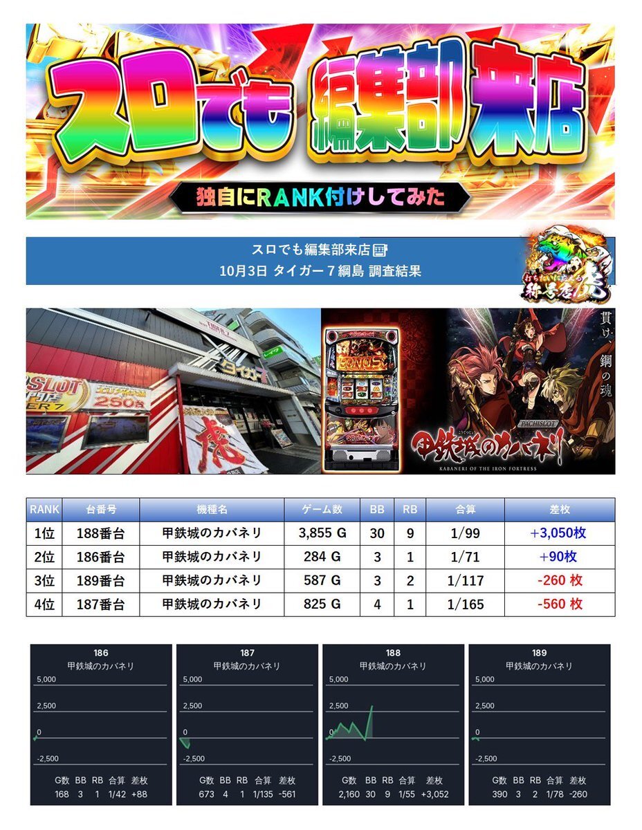 10.20(月)ベラジオ住之江店① 🏴ジャンバリ潜入来店取材(炎)🔥来店ver 🏴新開進来店(@kurobara_susumu) 🏴0のつく日 大阪住之江のスロット専門店に ジャンバリ潜入来店取材(炎)🔎✨ 📃9.30(火)ジャンバリ潜入来店取材(炎) 📌好調機種*抜粋 👘吉宗(3/4+) →平均差枚+約1,110枚 pic.x.com/KLZQRnX525 x.com/janbari_tyousa…