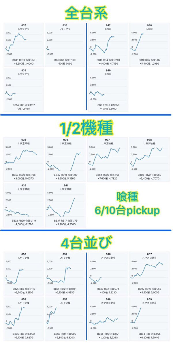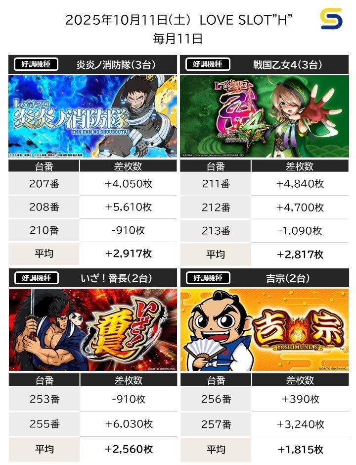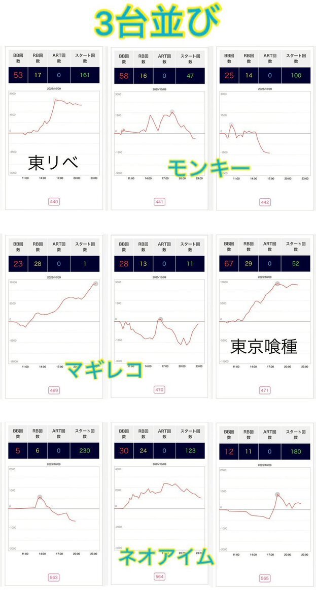 10/11 おやびんデータ☀️ ✅マルハン池袋本館 ・リアルブクロウ週間(10/7〜13) ・ニャンギラス😾 ・【天地】4店舗コラボ BIGディッパー新橋1号 レッドロック学芸大学駅前 抽選274名 総差枚+46,300枚 📌全台系候補 ・ハナ鳳凰 +2/2→平均+1600 ・L炎炎 +2/2→平均+1950 ・吉宗 +3/3→平均+11433👏 pic.x.com/qAg5xrKdrY x.com/goltranger/sta…