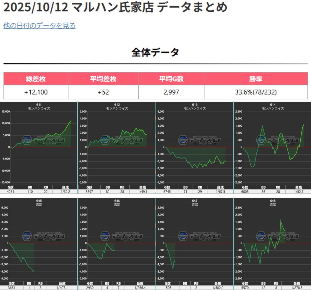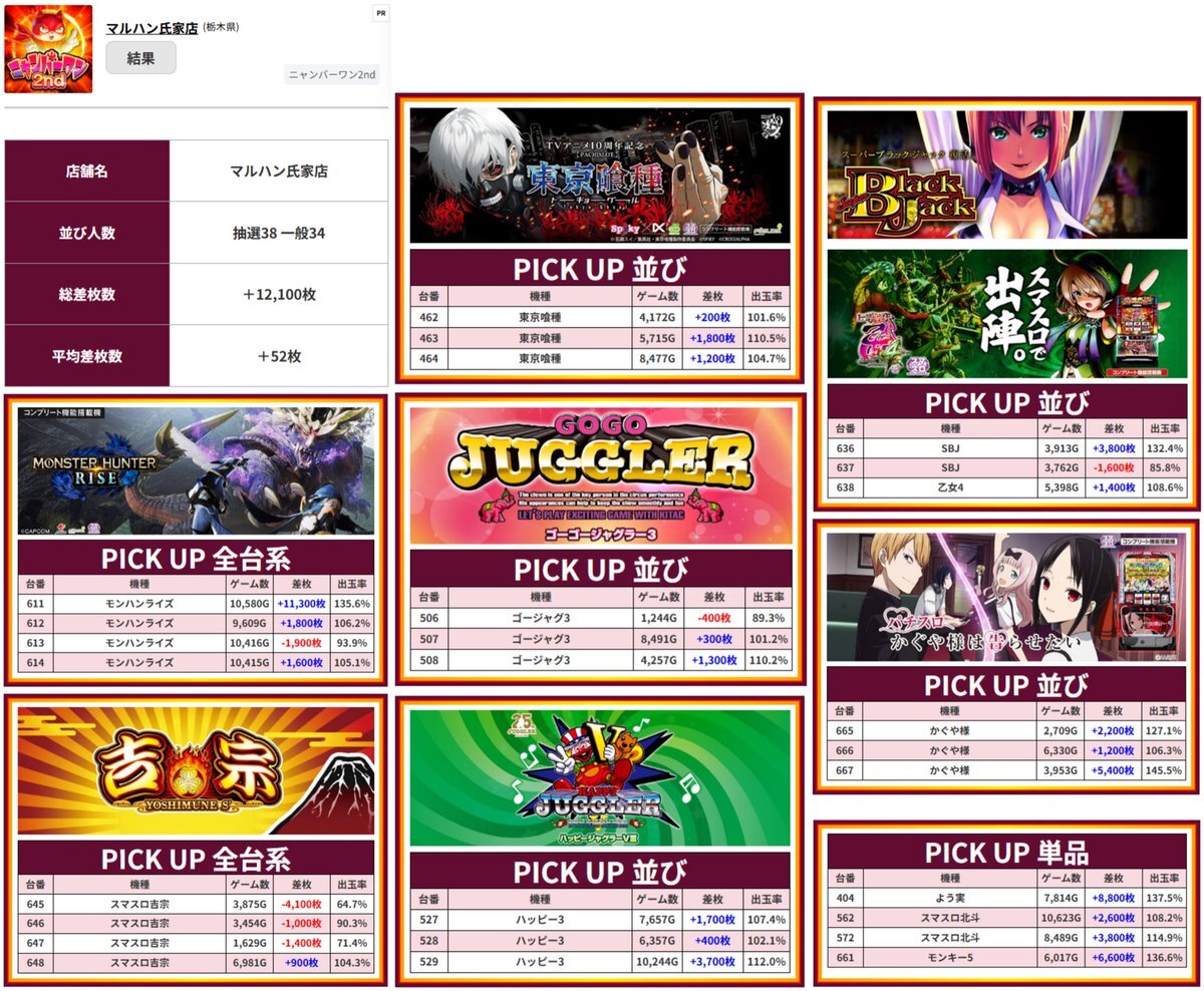 10/12 マルハン氏家 結果🗓️ 📝ニャンバーワン2nd 📝強化日からの連戦 📈全体平均+52枚 ⭐️抽選38人 💥全系×2 ・モンハンライズ 平均+3,200枚🌈 ・吉宗 🍡3台並び×5 ・東京喰種 ・かぐや ・SBJ.乙女 ・ゴージャグ ・ハッピー 📌その他ピック×4台🈶 pic.x.com/fGg0Qa57qF x.com/ikechinpachisl…