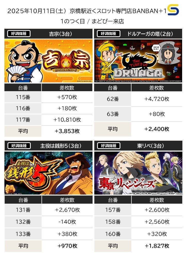 10.11(土) 京橋駅近くスロット専門店BANBAN+1 🏴1のつく日 🏴まどぴー来店(@Mado8mado) 🚩総差枚+2,580枚 🚩平均差枚+17枚 【好調機種】 🌾吉宗(3/3台) 合計差枚+11,559枚 平均差枚+3,853枚 🗼ドルアーガ(2/2台) 合計差枚+4,800枚 平均差枚+2,400枚 🏍️東リベ(3/3台) pic.x.com/UPRMdcuhCG x.com/kansai_slot/st…