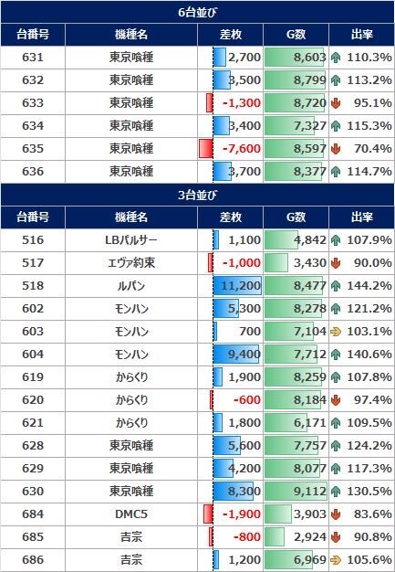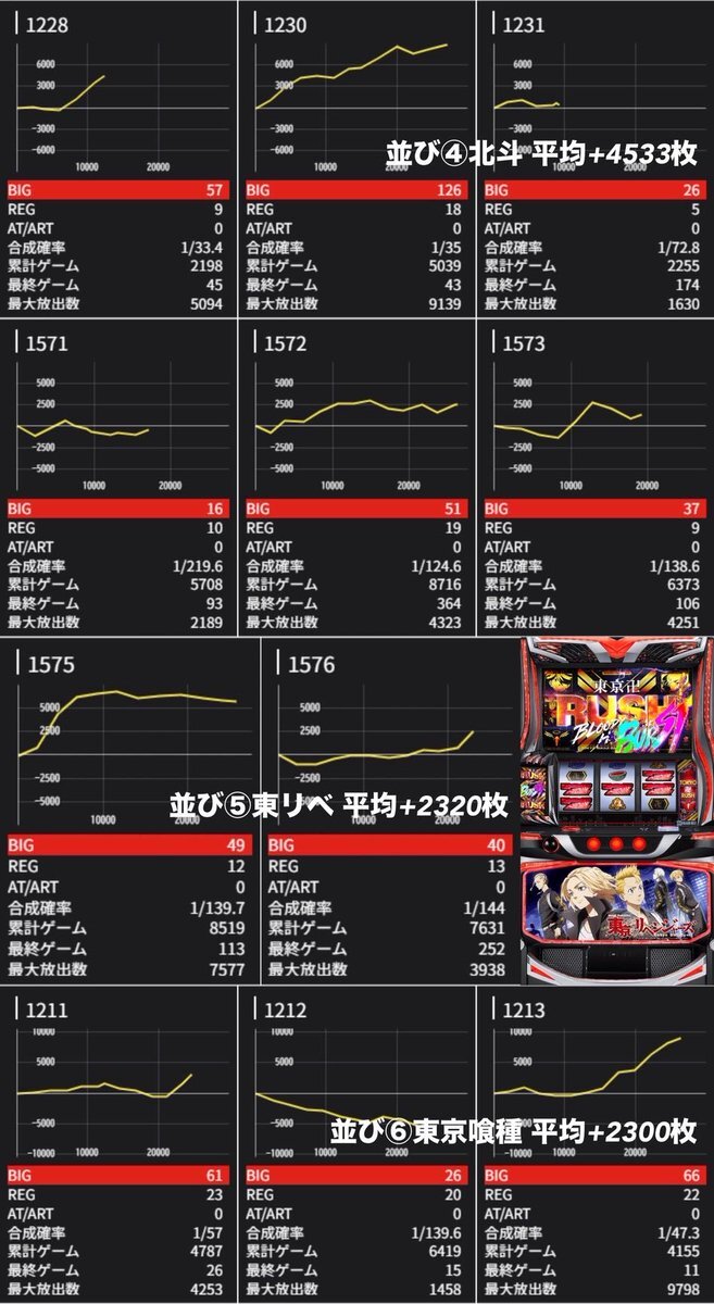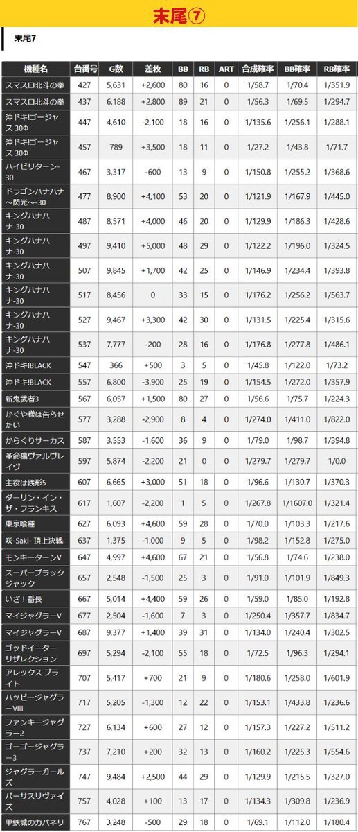 10月17日『マルハン水戸けやき台』結果 7のつく日 総差枚+12,500枚 平均36枚 🔶全台系 ・ガールズ +4/7台 平均+657枚 🔶末尾 ・末尾⑦ 勝率57% +20/35台 平均+783枚 🔶高配分 ・東京喰種 +6/10台 平均+1,400枚 ・ゴッドイーター +4/6台 平均+1,383枚 ・吉宗 +3/6台 平均+1,250枚 ・バイオ5 pic.x.com/f5jAEGveoW x.com/chiba_pachislo…