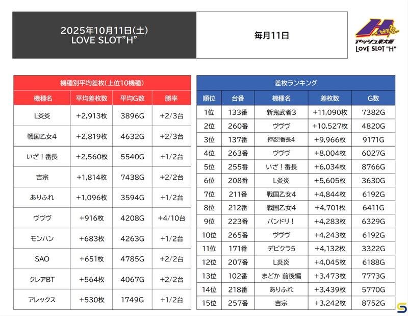 10.11(土)LOVE SLOT"H"① 🏴毎月11日 近鉄八戸ノ里駅前の人気店に 毎月11日(特定日)到来🎉✨ 🪧「毎月11日」傾向 ⑴全機種に可能性あり ⑵バラエティーに単品 ⑶特定末尾に高配分 →2連続で末尾⑥高配分🔥 📝9/11(木)毎月11日 🍖モンハンライズ(1/2+) →平均差枚+約3,710枚💮 x.com/Kansai_Slot_2n…