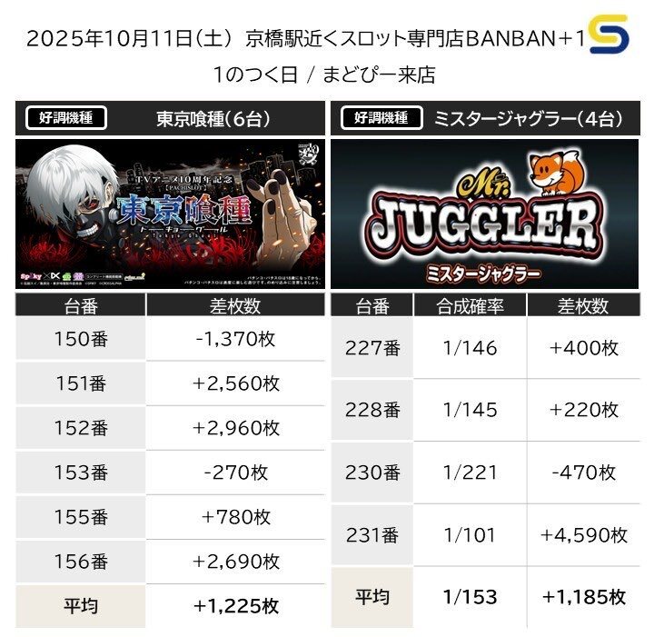 10.11(土) 京橋駅近くスロット専門店BANBAN+1① 🏴1のつく日 🏴まどぴー来店(@Mado8mado) 京橋駅近くのスロット専門店に 「1のつく日/特定日」が到来🌋 📜過去の配分傾向 ⑴フロア全体に並び(複数) ⑵ホール全体に単品多数 📝明日の狙い目*まずはここ! x.com/Kansai_Slot_2n…