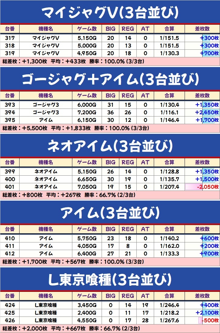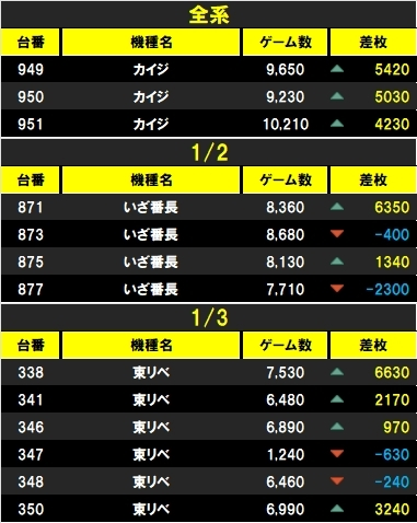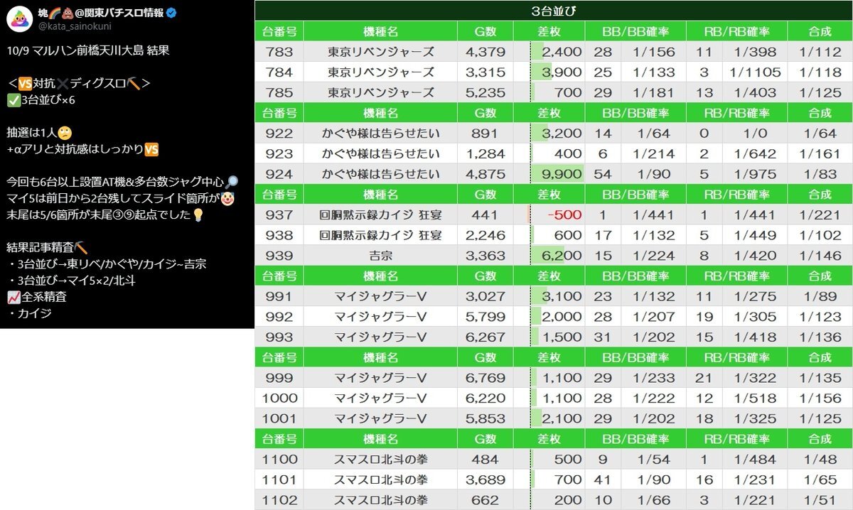 【🆚⛏️今回も9の日対抗ディグです⛏️🆚】 10/19 マルハン前橋天川大島 <🆚対抗✖週末🗓> ✅ディグスロ⛏ 前回10/9は抽選1人🙄 +αアリと対抗感はしっかり🆚 🗓10/9 ・3台並び→東リベ/かぐや/カイジ~吉宗 ・3台並び→マイ5×2/北斗 📈全系精査 ・カイジ 💡要点まとめ ◆傾向①:3台~並び4箇所以上 pic.x.com/eEDpwcxnfQ x.com/tenchouigarash…