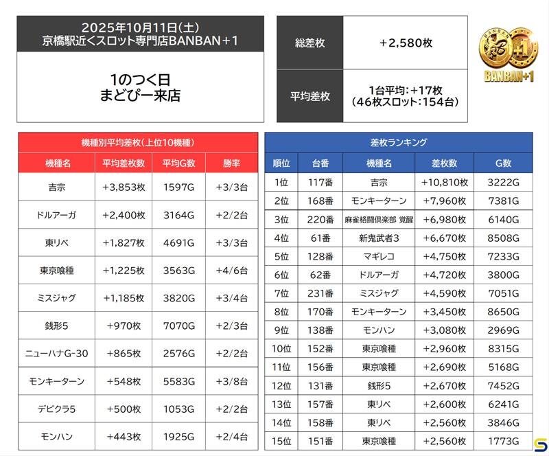 10.11(土) 京橋駅近くスロット専門店BANBAN+1 🏴1のつく日 🏴まどぴー来店(@Mado8mado) 🚩総差枚+2,580枚 🚩平均差枚+17枚 【好調機種】 🌾吉宗(3/3台) 合計差枚+11,559枚 平均差枚+3,853枚 🗼ドルアーガ(2/2台) 合計差枚+4,800枚 平均差枚+2,400枚 🏍️東リベ(3/3台) pic.x.com/sjc3rn5oJm x.com/kansai_slot/st…