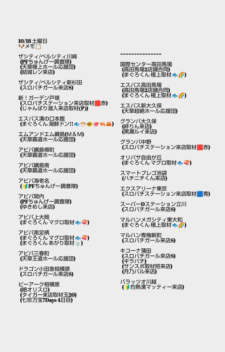10/18 土曜日 🐶メモ📋️ ザシティ/ベルシティ川崎 (PFちゅんげー調査隊) (天草極上ホール応援団) (結城レン来店) ザシティ/ベルシティ新杉田 (スロパチガール来店S) 新!ガーデン戸塚 (スロパチステーション来店取材🟥赤) (じゃんばり潜入来店取材❨P❩) エスパス溝の口本館 x.com/norakobu/statu…