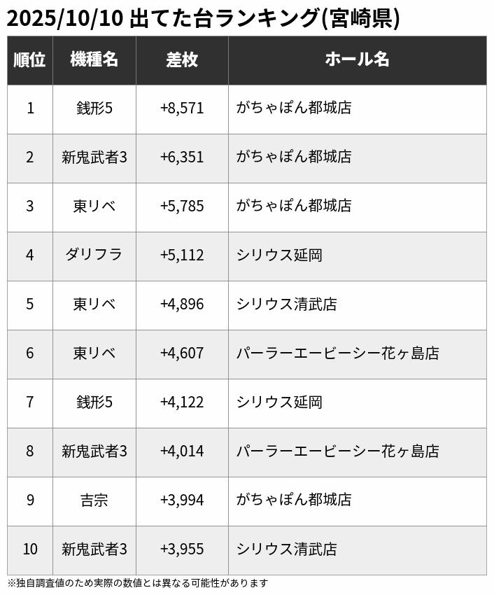 🏆10/10 出てた台ランキング(宮崎県) ※一部の爆裂機を除く 🥇銭形5 +8,571 🥈新鬼武者3 +6,351 🥉東リベ +5,785 🌟ダリフラ +5,112 🌟東リベ +4,896 🌟東リベ +4,607 🌟銭形5 +4,122 🌟新鬼武者3 +4,014 🌟吉宗 +3,994 🌟新鬼武者3 +3,955 ana-slo.com/%E3%83%9B%E3%8… pic.x.com/nADbhaoHW8