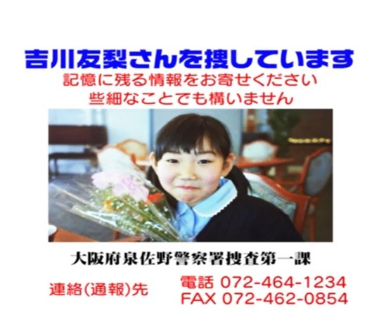 俺が昔住んでいた大阪府熊取町で行方不明になった吉川友梨ちゃん、 まだ見つかってないんか... 元気にしとったらいいなぁ。