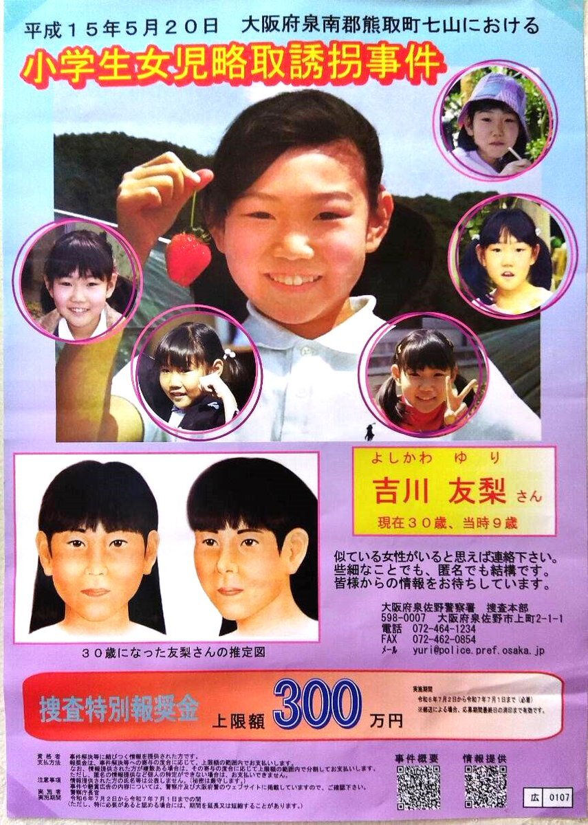 吉川友梨さんを捜しています。 平成15年5月20日午後3時頃、大阪府泉南郡熊取町七山から吉川友梨さん(当時9歳)が行方不明になっています。解決に結びつく有力情報には、上限300万円の報奨金が支払われます。 詳細は、ホームページをご確認下さい。 police.pref.osaka.lg.jp/jiken/jyoho/2/… pic.x.com/hjAMCZ9sAN