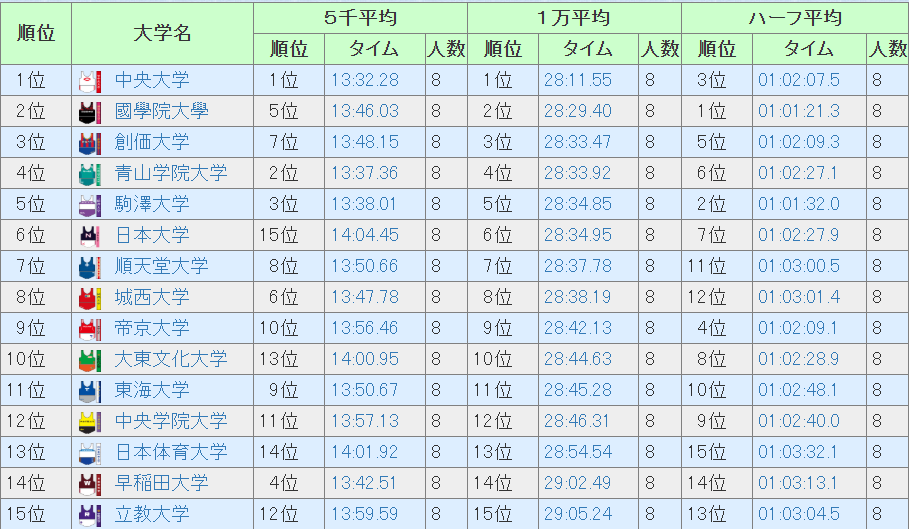 全日本に出場する関東勢の平均持ちタイム(8人)はこんな感じ…出雲の5千同様に中央が抜けていて、國學院、創価と続いています。 東洋がいないことの違和感がなかなか💦柏原入学後ずっと3大駅伝に出場を続けていたからなあ… sat-ekiden.info/search/average…