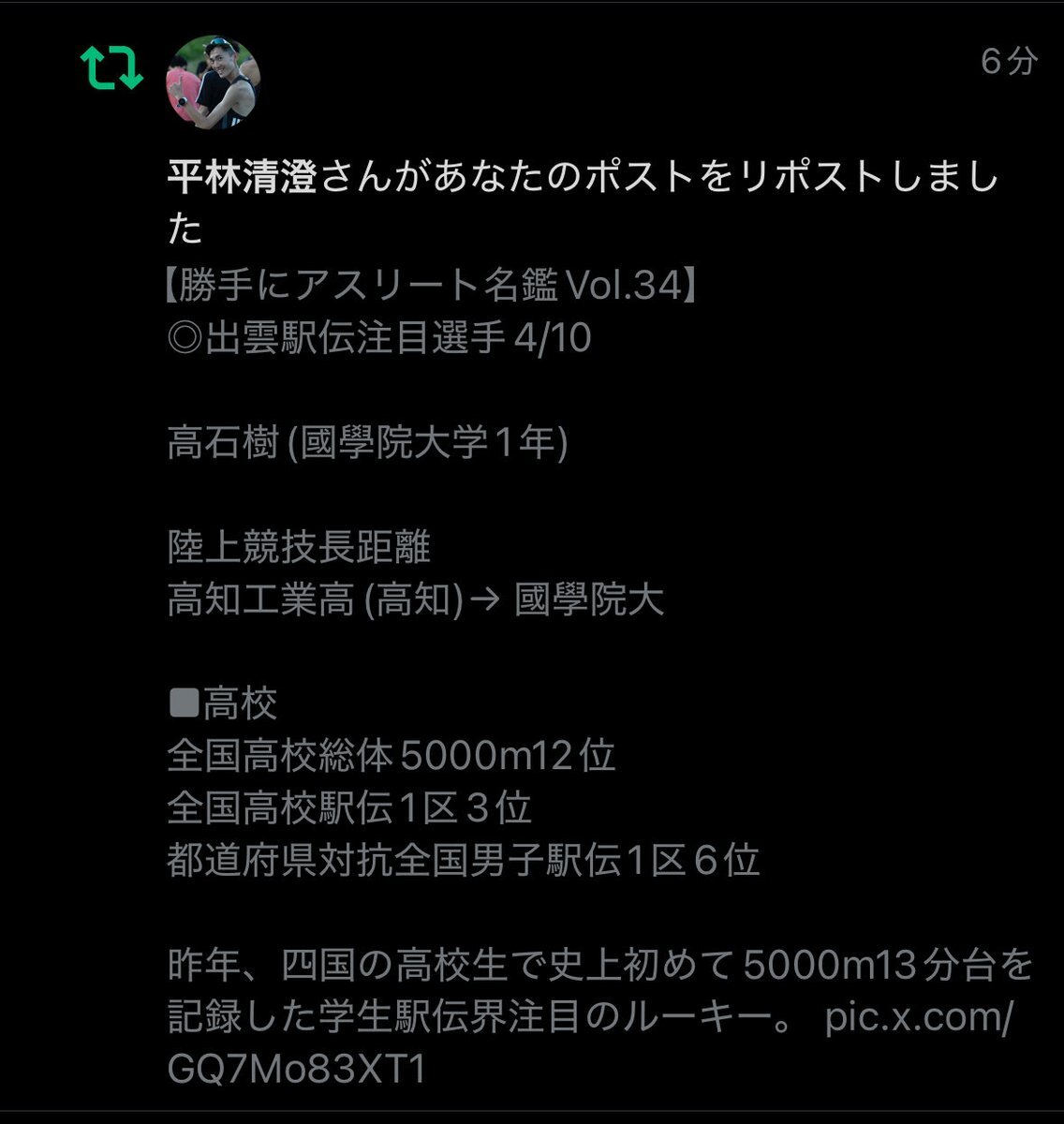 第34弾にして表示回数3万回超え! この投稿がなければ選手のことを知らなかったであろう人にまで届いたと考えたらうれしい! そして学年こそ離れているものの 高石選手の先輩にあたる 平林清澄選手(現:ロジスティード) からも反応が! 國學院大学時代 ・(3年)全日本大学駅伝7区 区間賞 pic.x.com/Smwl2iGV21 x.com/athlead_career…