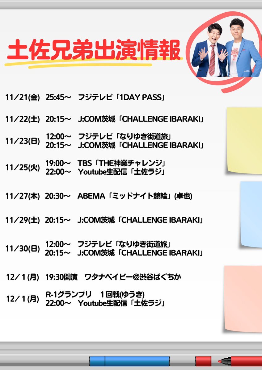 土佐兄弟出演情報】 〈PICK UP〉 ▼本日深夜は「1DAYPASS」菅原茉椰さんと企業に潜入してきました🏢 ▼11/23のなりゆき街道旅麺街道は大久保の辛麺🍜 ▼12/1は土佐兄弟/四千頭身/豆鉄砲/ナチョス。のユニットライブ「ワタナベイビー」今年ラスト! tiget.net/events/439325 【📸】 この前のWEL🎙️ pic.x.com/AzDotrIjCM