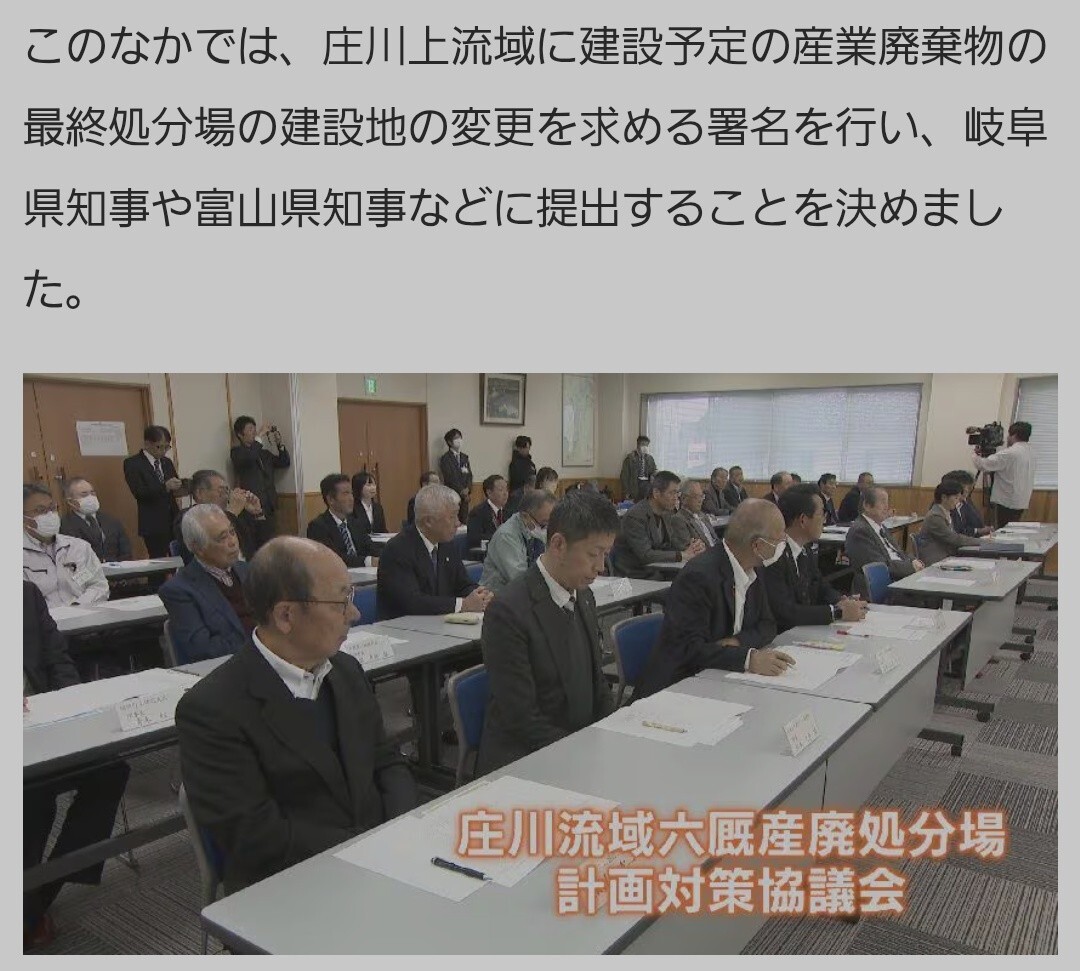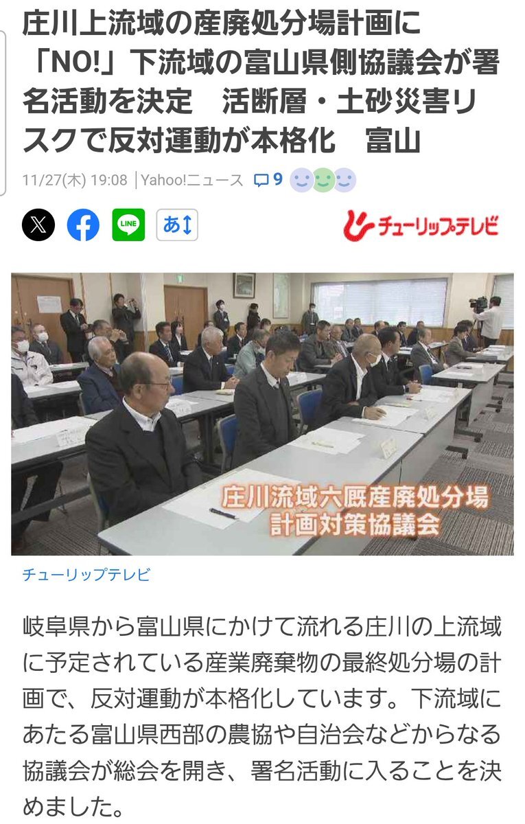 庄川上流域の産廃処分場計画に「NO!」下流域の富山県側協議会が署名活動を決定 活断層・土砂災害リスクで反対運動が本格化 富山(チューリップテレビ)#岐阜県 #飛騨高山 #白川郷 #岐阜県高山市荘川町六厩産業廃棄物処理場建設反対 #庄川 news.yahoo.co.jp/articles/f49fb…