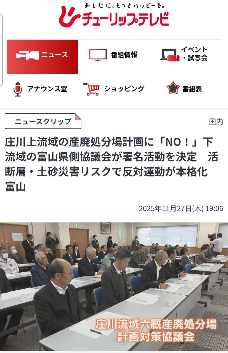 庄川上流域の産廃処分場計画に「NO!」下流域の富山県側協議会が署名活動を決定 活断層・土砂災害リスクで反対運動が本格化 富山 11/27(木) #岐阜県 #富山県 #庄川 #白川郷 #飛騨高山 #五箇山 #岐阜県高山市荘川町六厩産業廃棄物処理場建設反対 pic.x.com/iJrYodzxmP