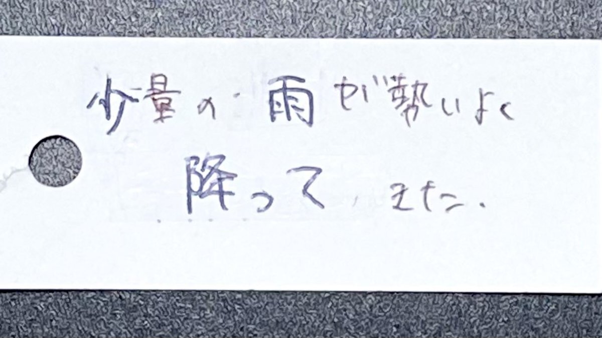 みっつめは"雪崩れ込んできた"を"降ってきた"に変えてもらった。 これで大丈夫。 "大量の土砂が勢いよく雪崩れ込んできた"は、"少量の雨が勢いよく降ってきた"になった。 風がついてたりしたら、ちょっとの雨でも勢いはつくし、違和感は無いはず。 pic.x.com/JOEAEewNtd