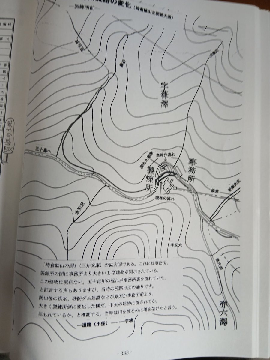 【持倉鉱山川の流れ】 現在の五十母(いそも)川は、鍰煉瓦事務所と製錬所の中を通っていますが往時は事務所の裏手を通っていました。現在の川の場所には、沢のような川がありました。裏手の川がオーバーフローした時のバイパス役目があったと思われます。旧川は、雪崩による土砂崩壊などで埋まったかも pic.x.com/ZgKTl8VsdU