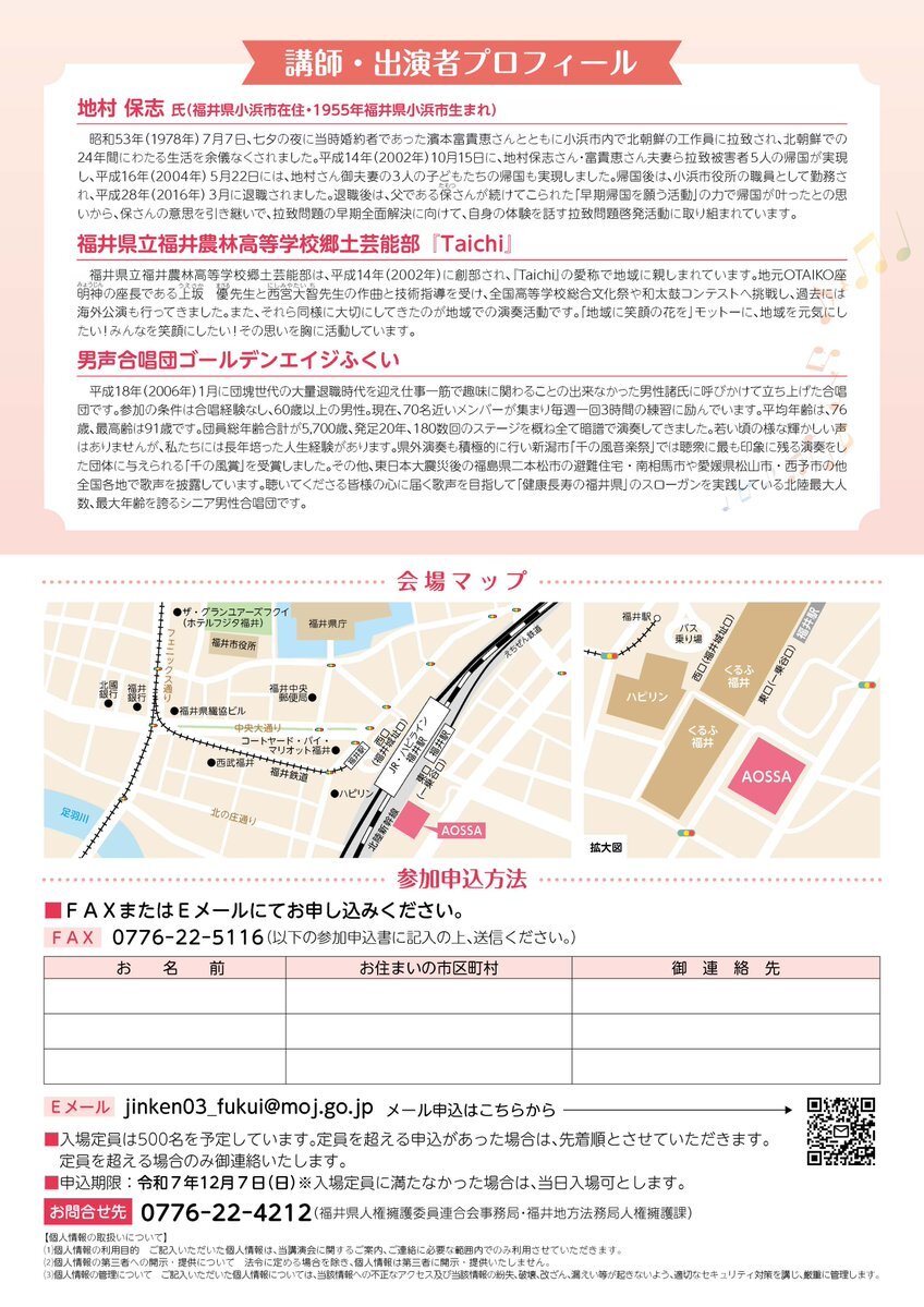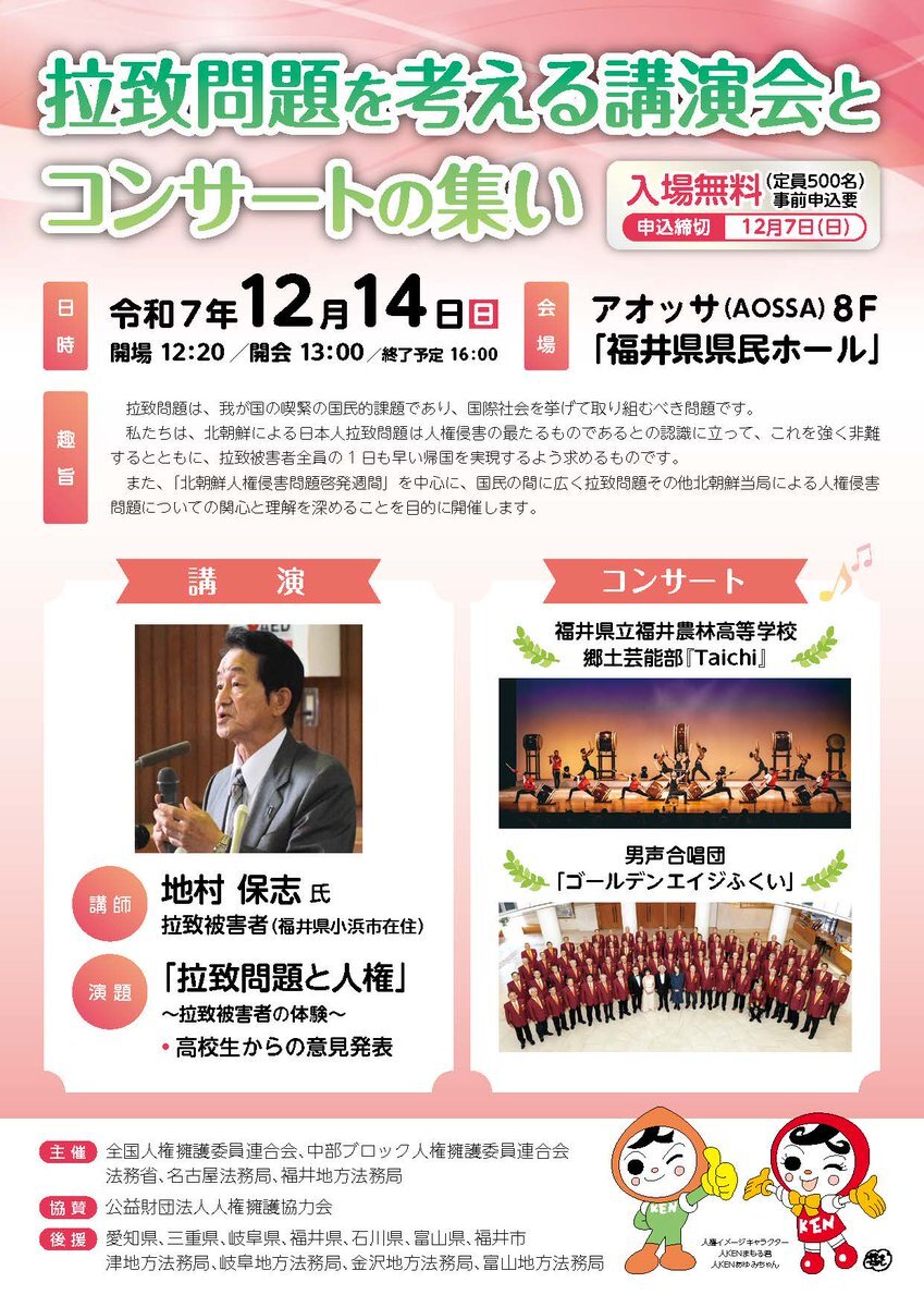 【拉致問題を考える講演会とコンサートの集い@福井】 12/14(日)13:00~16:00、#アオッサ(AOSSA)8Fにて、#地村保志 さんを講師に招いた講演会と、福井農林高等学校郷土芸能部及び男声合唱団「ゴールデンエイジふくい」によるコンサートを開催します。 ぜひご参加ください。 pic.x.com/TaP8D2HKFo
