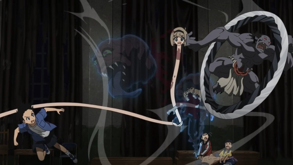 (7/7)→妖刀を抜いて一瞬で人面疽を切り離すが、止めを刺す前にはたもんばが復活してしまう。美樹がろくろ首を伸ばして人面疽に巻きついて押さえ込み、はたもんばを誘導して人面疽を切り離す。はたもんばは復活したぬーべーが鬼の手で再び退けた #地獄先生ぬ~べ~ #ぬーべーアニメ #hellteacher