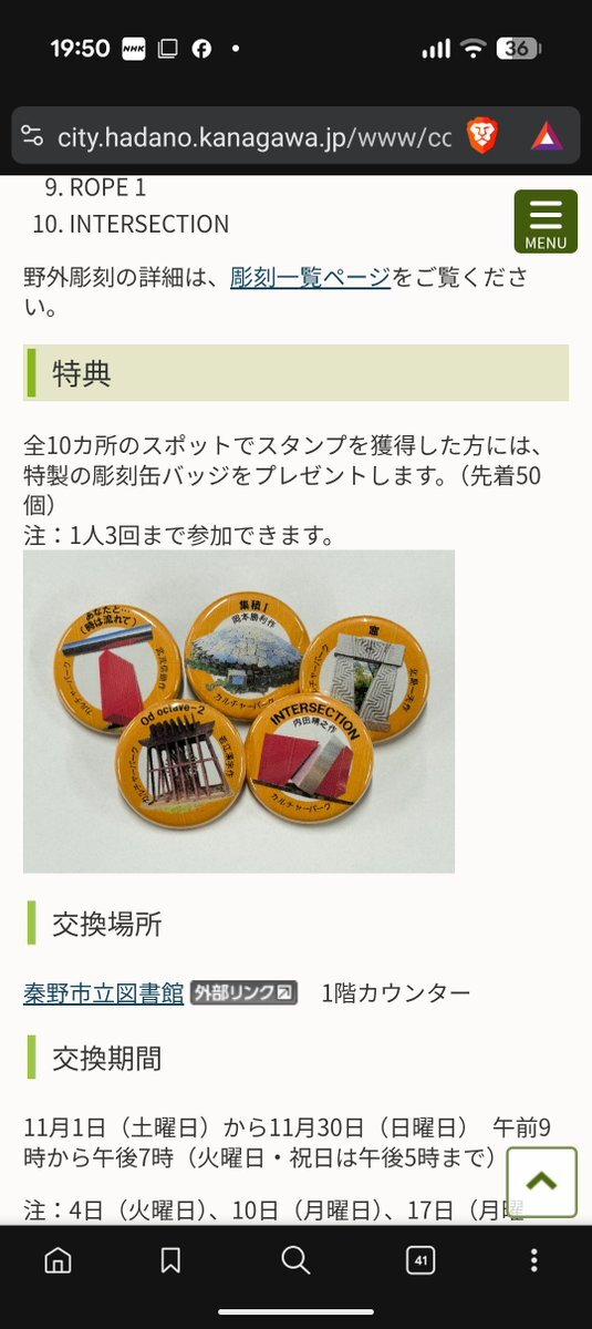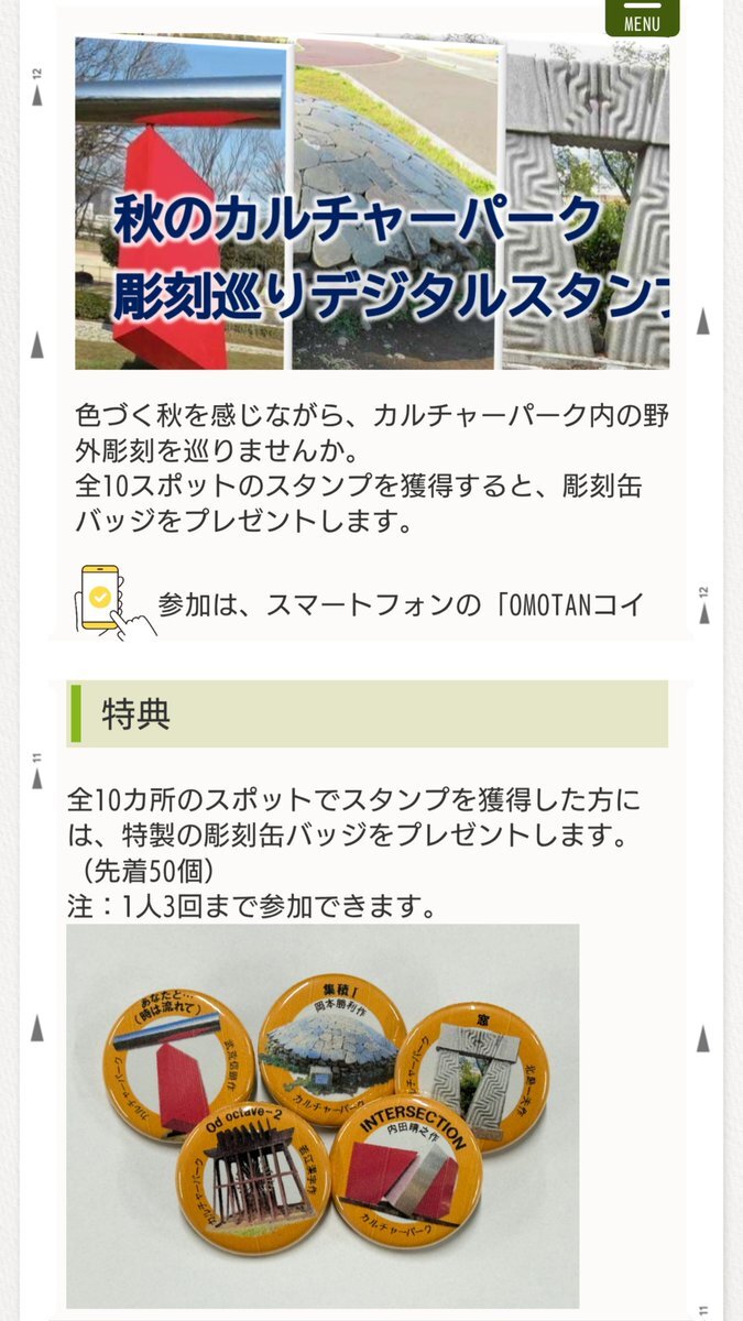 【彫刻巡りスタンプラリー】 昨日11/1(土) 報徳サミット会場で大会宣言決議を聞き〜菊花展を鑑賞 その後 カルチャーパーク彫刻デジタルスタンプラリーへ 公園内をウロウロしながら10個のスタンプをGET 今日2(日)缶バッジ(集積I)を貰い受けた あと2回出来るのでまた散歩しょう! pic.x.com/OxR8xKBXWh