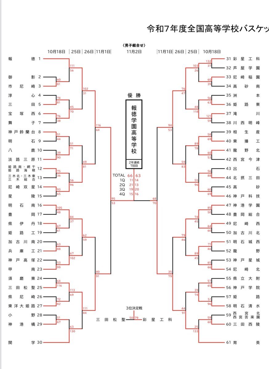 ウインターカップ2025 兵庫県予選 🚹🚺結果 hyogobasketball.jp/hs/r7/senbatsu… 男子 優 勝:報徳学園 準優勝:育英 第3位:彩星工科 第4位:三田松聖 女子 優 勝:三田松聖 準優勝:神戸龍谷 第3位:日ノ本 第4位:市立尼崎 pic.x.com/HpeyQFzwbg
