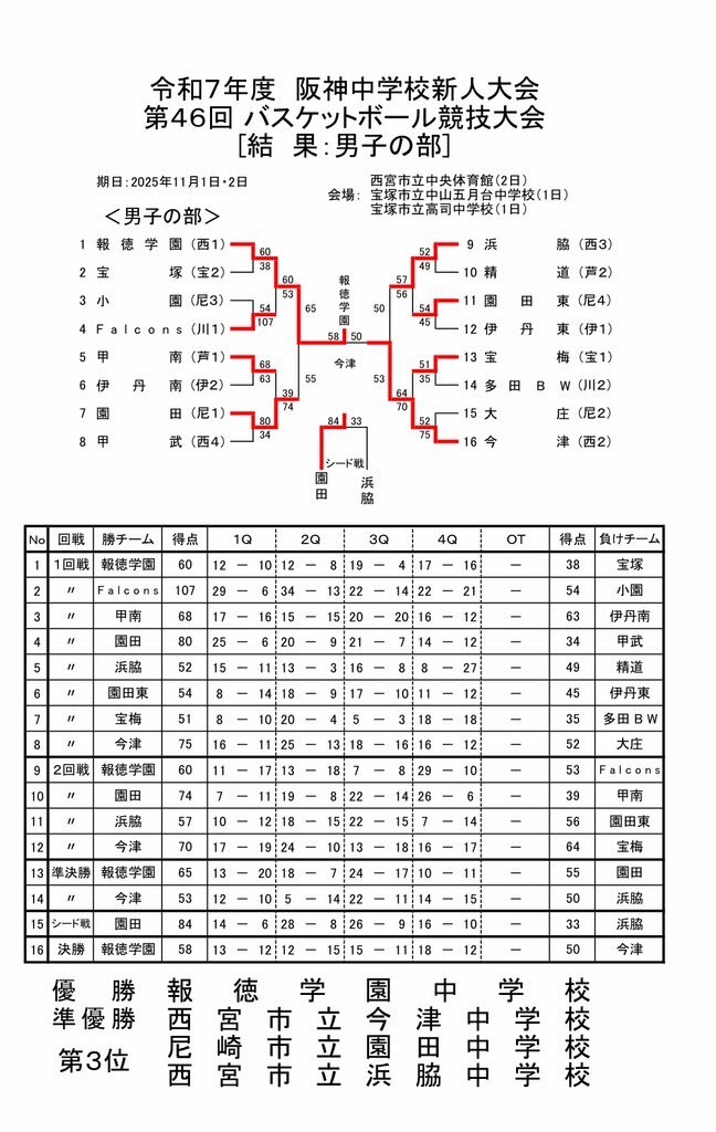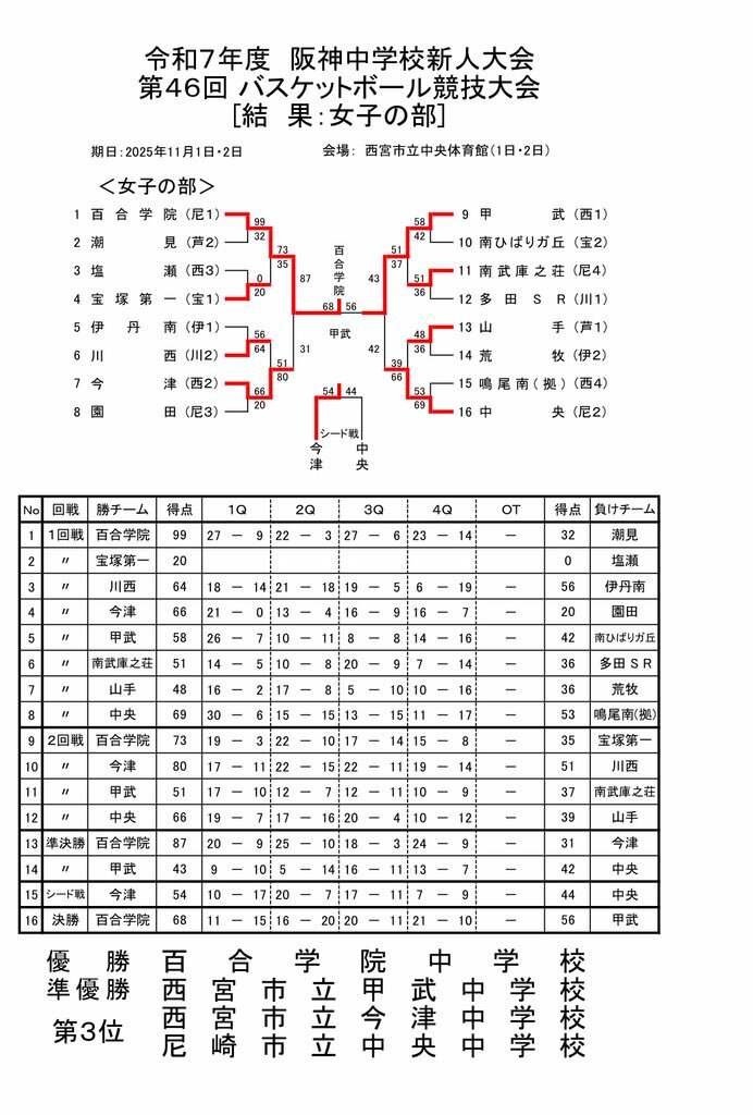 💫阪神中学校新人大会 ⭐️最終結果 女子 優 勝 百合学院中学校 準優勝 西宮市立甲武中学校 第3位 西宮市立今津中学校 第3位 尼崎市立中央中学校 男子 優 勝 報徳学園中学校 準優勝 西宮市立今津中学校 第3位 尼崎市立園田中学校 第3位 西宮市立浜脇中学校 pic.x.com/tP8OcHFSG8
