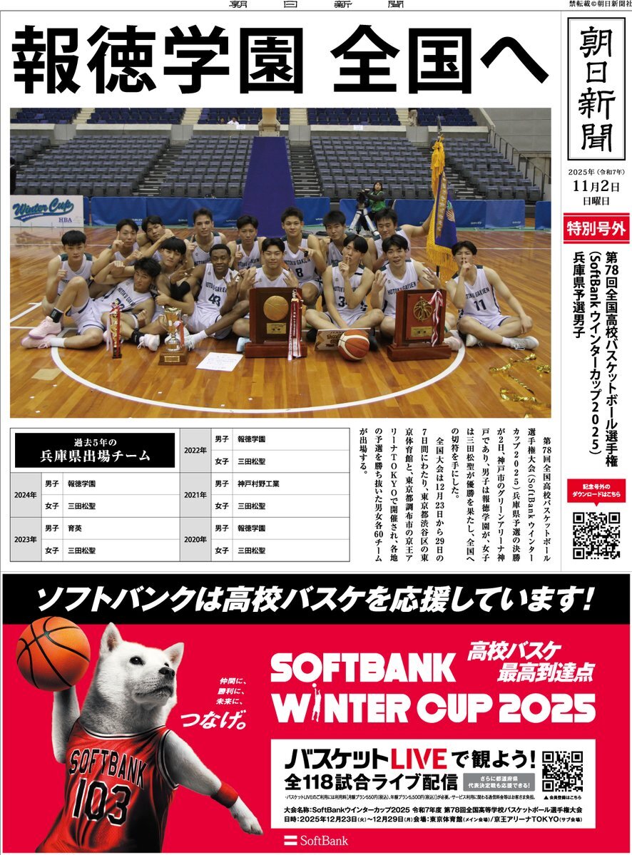 ┏━━━━速報━━━━┓ 祝 報徳学園高校 #SoftBankウインターカップ2025 男子 兵庫県代表に決定! ┗━━━━━━━━━━┛ 兵庫県のみなさま 報徳学園高校を全力で応援しましょう! PDF記念号外はこちらから asahi.com/sports/events/… #ウインターカップ #ウインターカップ記念号外 #高校バスケ pic.x.com/stiDUfg4hR