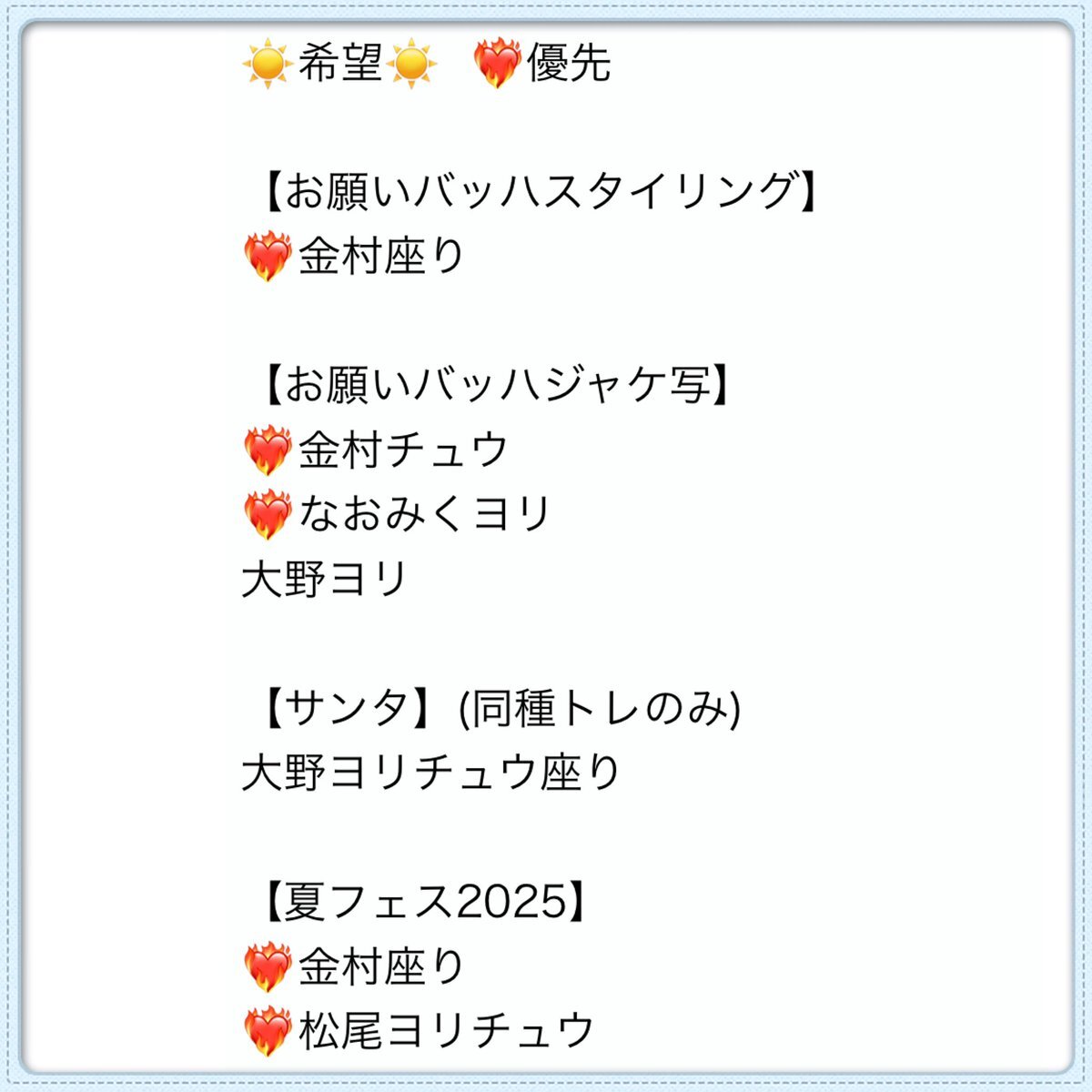 夏フェスヨリとサンタ、OTR 集めて帰りたい あと相方の推し含め無いのが 夏フェス⬇️ 金村、松田、石塚、大野のヨリ! サンタ、OTRは画像の通りです 明日トレできる人いれば是非!! 手持ち残りとくじ持っていきます