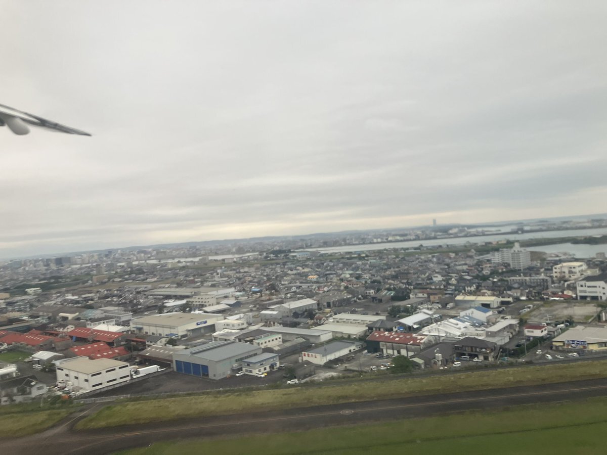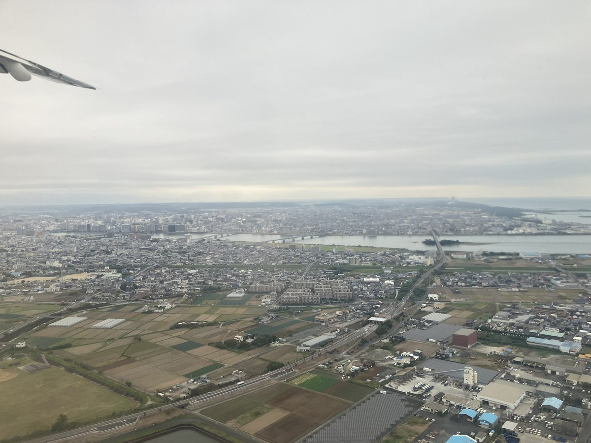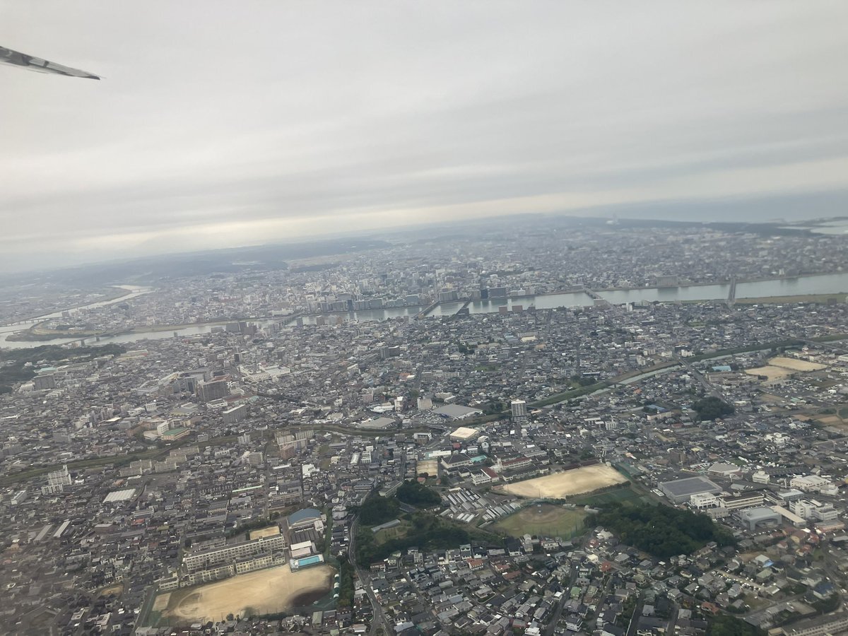 離陸の時に撮った宮崎市街地。大淀川を挟んで向こう側に大きな建物が多く建っていることが分かる。また大淀川が大きくくねっていて向こう側を取り囲んでいる。戦国時代だと天然の堀の役割を果たしていそうだ。宮崎市と大淀川の関係を深掘りしていく面白い事が分かるかもしれない。 pic.x.com/efDG4k5bdC