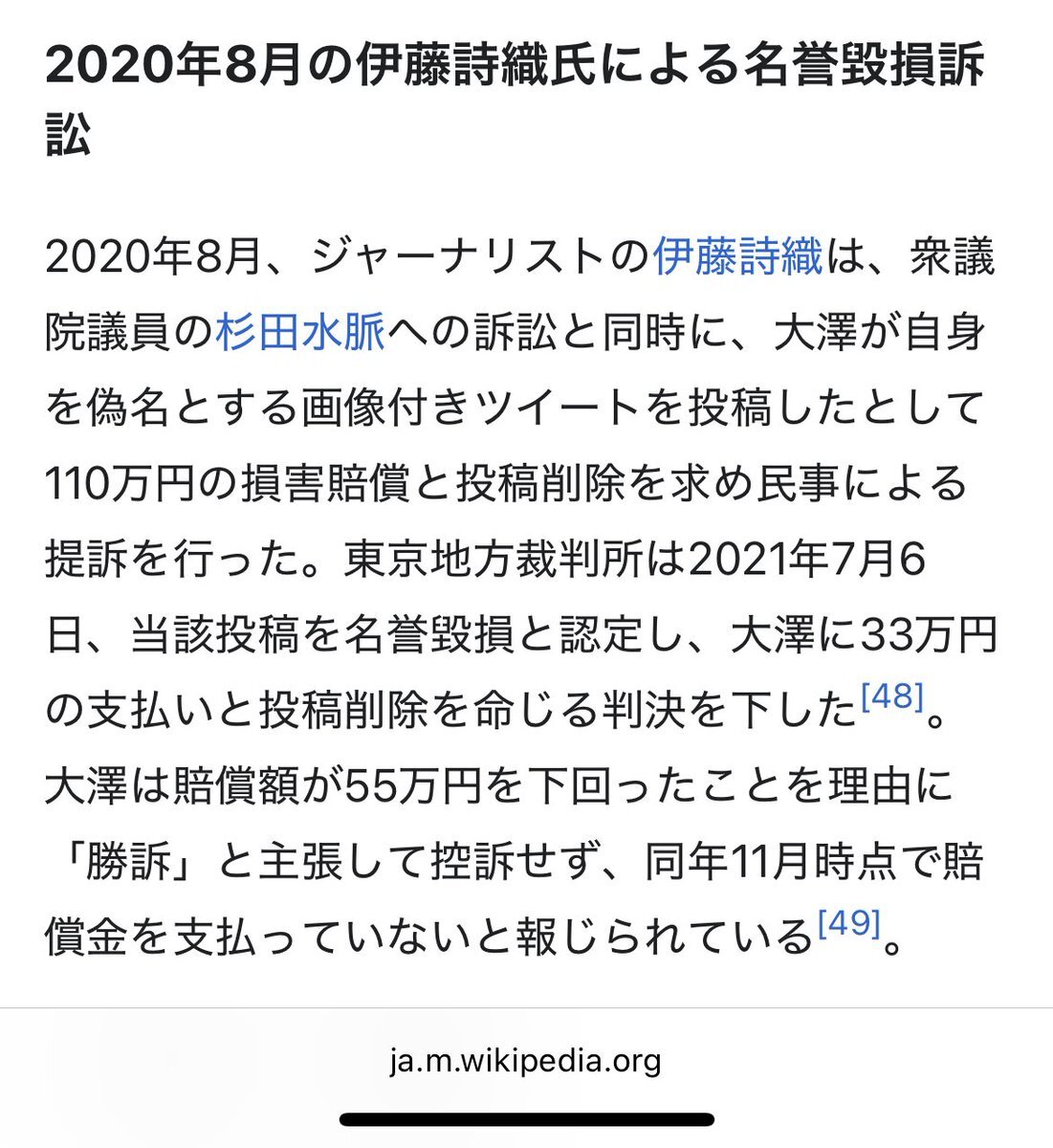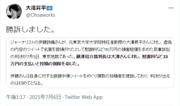 どうやら「伊藤詩織って偽名じゃねーか」で賠償命令を出されるも謎に勝利宣言していたらしい大澤昇平が渡辺英徳に330万請求していたらしいが 大澤理論で行くと渡辺英徳の勝ち? ja.wikipedia.org/wiki/%E5%A4%A7… pic.x.com/aNhy5eZ483 x.com/kyodo_official…