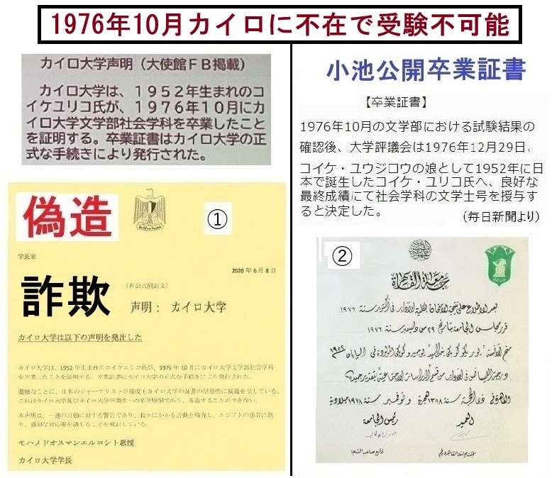1976年10月小池百合子がカイロ不在で受験できなかった証拠 ◆石井妙子 女帝小池百合子の407ページに、 1976年10月エジプト南部への旅行、 その後サダト大統領夫人来日に合わせて日本に行ったため、 カイロにはほとんどいなかった。 1976年10月11日、小池が「日本に帰ってきた」と言った。 pic.x.com/9Tro0Pckza