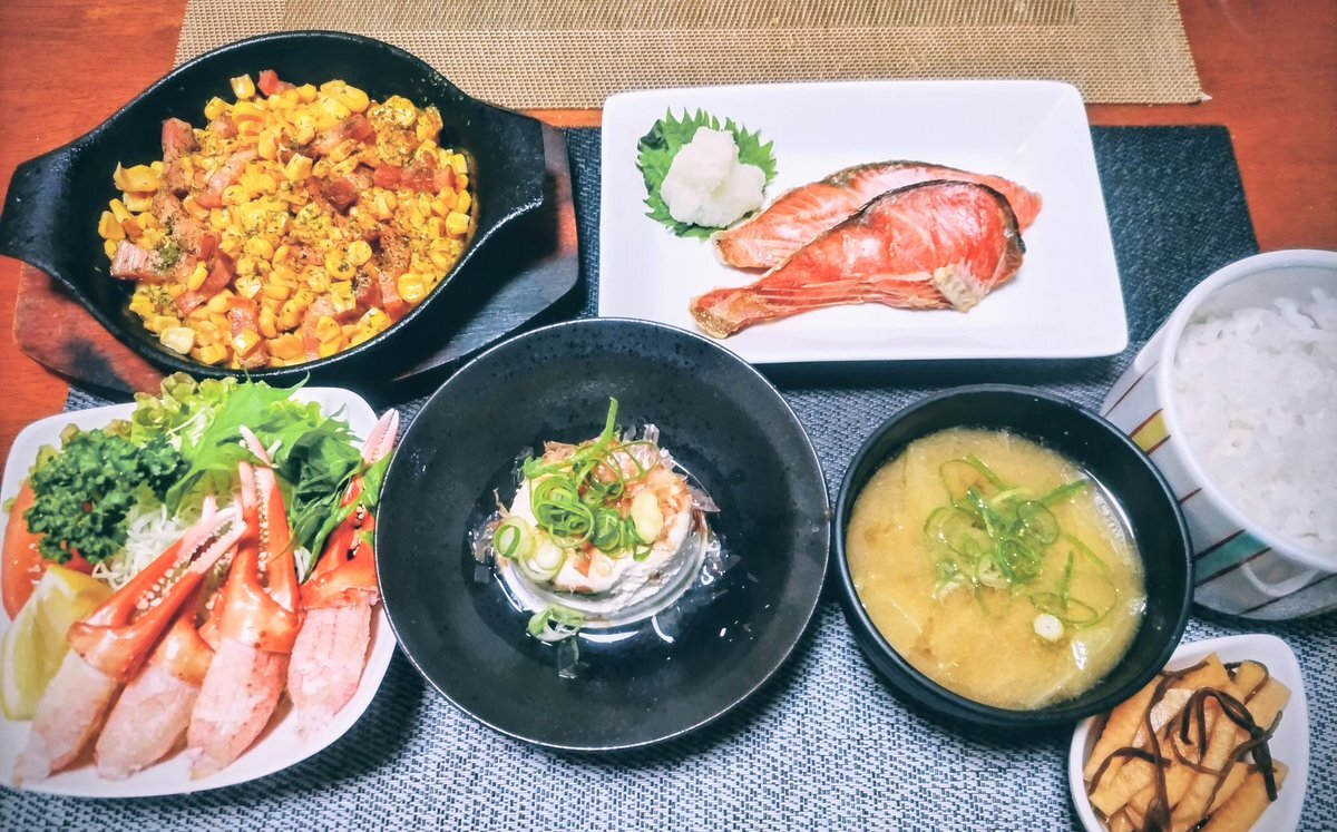 今日のご飯! 焼き鮭定食(ノ◕ヮ◕)ノ*.✧ワーイ! バターコーンと蟹爪サラダ 箸休めの奴さん(◕ᴗ◕✿) 大根の昆布漬け作ってみた 召し上がれ。◕‿◕。 pic.x.com/qm6TvmqO3R