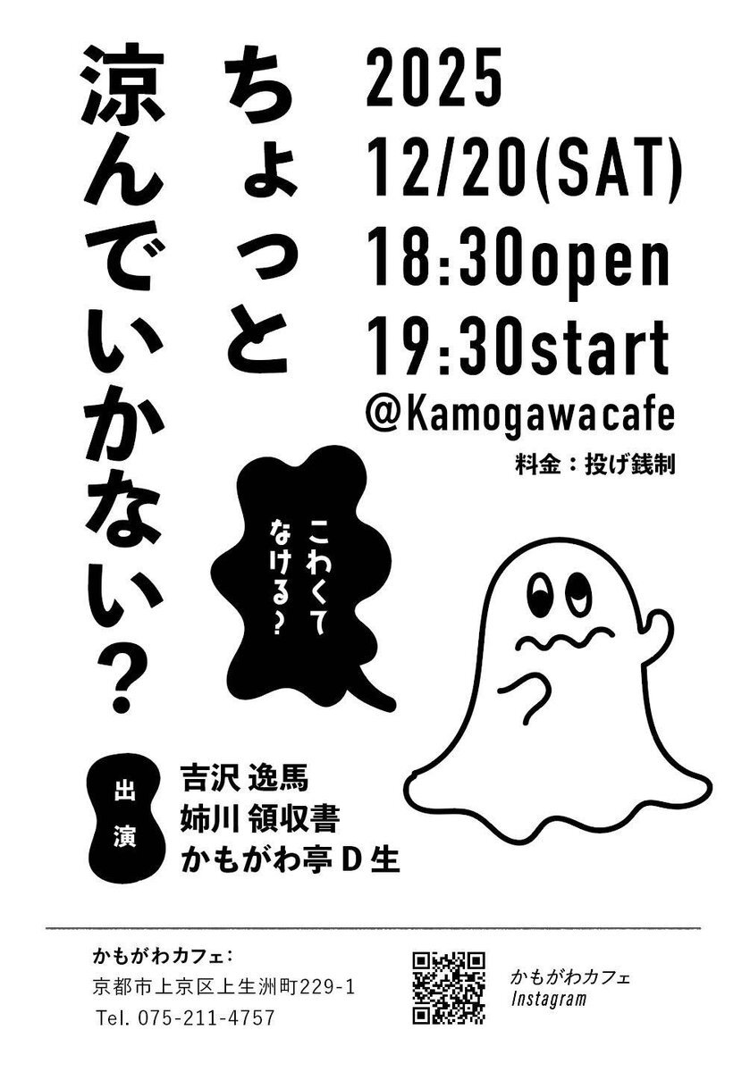12月20日土曜日 19時30分から 京都・かもがわカフェで (最寄り駅は京阪神宮丸太町) イベント(落語と実話怪談) 「ちょっと涼んでいかない?」を開催します 吉沢逸馬 姉川領収書 かもがわ亭D生 ワンオーダー+投げ銭制です オススメは、珈琲とスコーンです 撮影禁止配信無し お待ちしています…