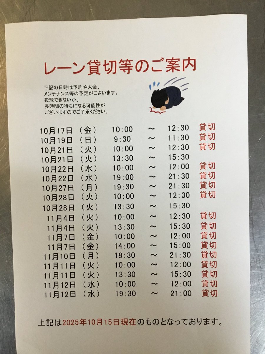 10月17日〜11月12日までのレーン貸切情報です。 状況によって混雑する場合がございます。 予めご了承くださいませ🙇♂️🙇♀️ #ぼうりんぐ #ひろしま #安佐南区 pic.x.com/L4BklCWhsM