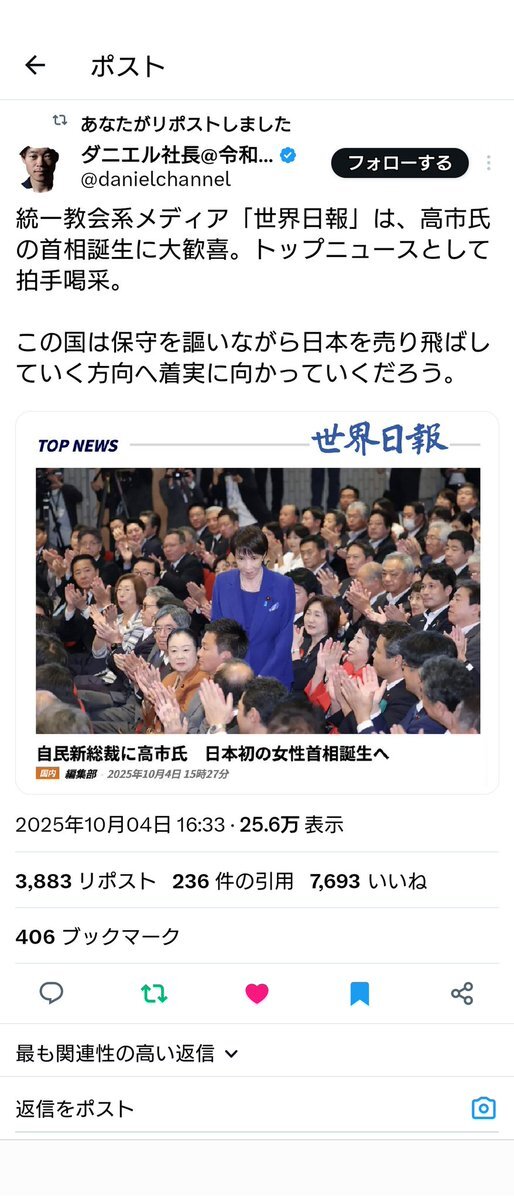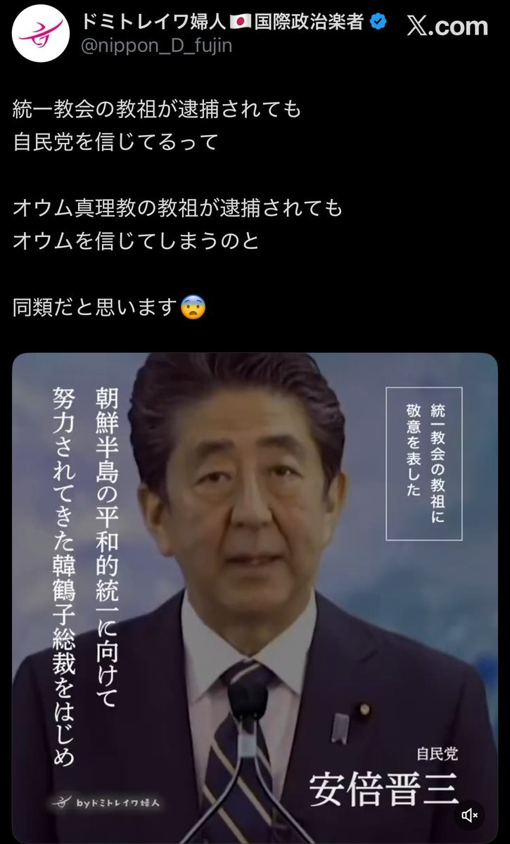 返信先:@Sankei_news安倍晋三らが始めた似非右翼しぐさを「保守」などと呼称するのはやめていただきたい。 自民党には統一教会(世界平和統一家庭連合/国際勝共連合/天宙平和連合 等)との断絶を強く期待します。 ハン・ハクチャ(韓鶴子)総裁は逮捕されました。高市早苗さん、日本でも裁きを与えましょう。