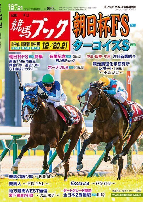 週刊競馬ブック[12月15日(月)発売号]◇朝日杯FS、ターコイズ◇ 有馬記念登録、ホープフルS登録。中山・阪神注目新馬紹介。競走馬理化学研究所レポート・前編。Essence。競馬の語り部。競馬人。地方競馬WEST通信~宮下瞳騎手引退。全日本2歳優駿Jpn1(川崎)。