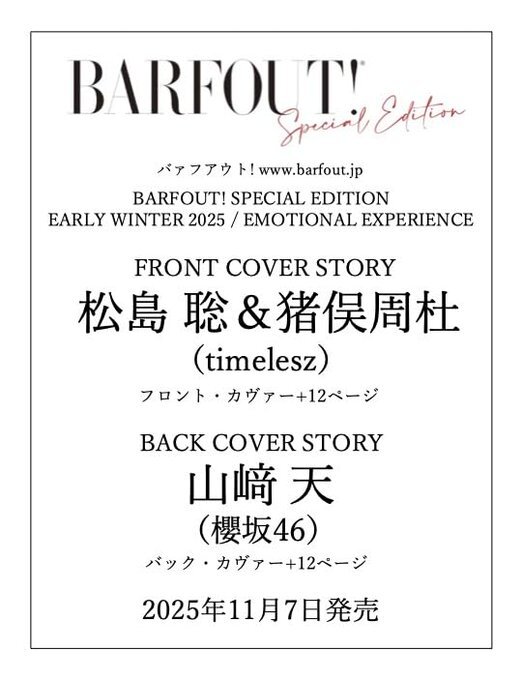 BARFOUT! SPECIAL EDITION EARLY WINTER 2025 11/7発売 ⬇️Amazon amzn.to/47fFwuI 表紙 #松島聡 #猪俣周杜 (timelesz) 裏表紙 #山﨑天 (櫻坂46) 宮沢氷魚 前田拳太郎 水上恒司 水沢林太郎 ROTH BART BARON [PR]