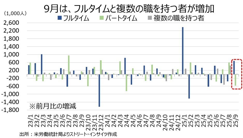 【9月 #米雇用統計⑤】フルタイムと複数の職を持つ者が増加 ・米9月雇用統計の家計調査、雇用形態別でフルタイムが前月比67.3万人増、3カ月ぶり増加 ・複数の職を持つ者は同1.7万人増、2カ月連続増加 ・パートタイムは同57.3万人減、3カ月ぶり減少 👉パートタイムの減少、不完全雇用率の低下と整合的 pic.x.com/WJAusm1JYY