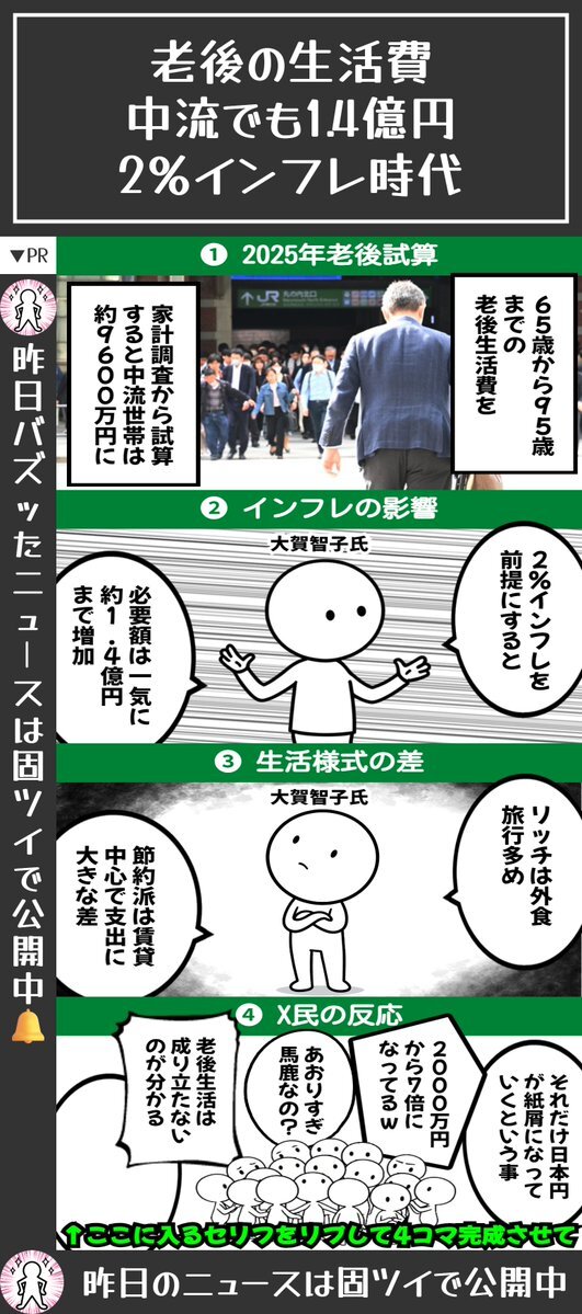📌老後の生活費いくら必要? 中流世帯でも1.4億円、2%インフレなら ↓ 65歳から95歳までの生活費を家計調査で試算 ↓ 2%インフレで中流世帯の老後費用は約1.4億円に増加 ↓ 節約派とリッチ派で老後の支出に大きな差 ↓ X民から様々な声集まる ←今ここ ↓ 🔻4コマでまとめるとこんな感じ pic.x.com/cIEPWiNRtp
