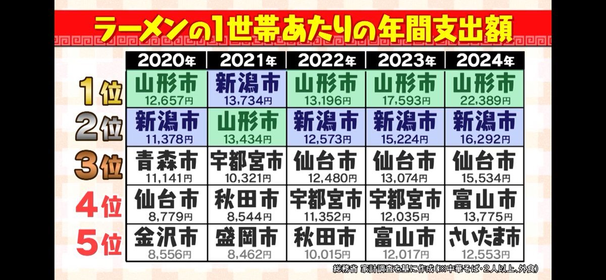 これお店の売り上げではなく、毎年「国に無作為に選ばれた家計調査対象の家庭のラーメン代が多いかどうか」なので、家計調査対象の仙台市民が山形市でラーメン食べたら仙台市の金額が増える訳で、ご当地ラーメンの有無はあまり関係ないんですよね。 単純にラーメン好き市民ランキングとも言えます🍜 x.com/jiro_sendai102…