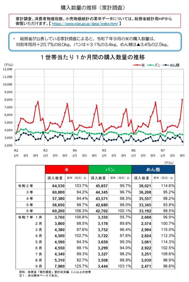米の流通状況等について:農林水産省 maff.go.jp/j/syouan/keika… 小売店業態別の価格動向・地域別の価格動向マップ(令和7年11月21日)(PDF : 436KB) maff.go.jp/j/syouan/keika… 総務省が公表している家計調査によると、令和7年9月の米の購入数量は、対前年同月+25.7%の8.0kg pic.x.com/BHFmpaHhxY