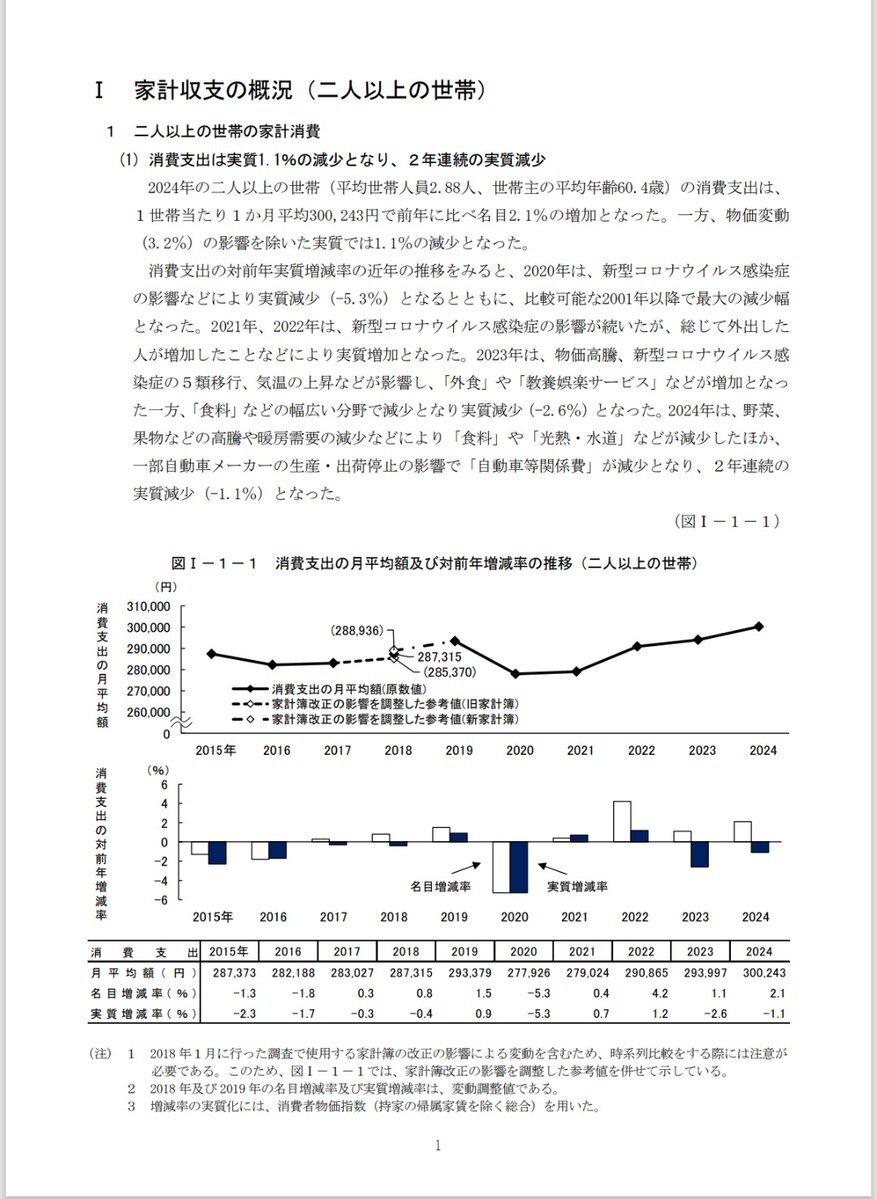 消費税増税後のグラフ見て「幻想」? いやいや、2014年8%増税直後の落ち込みは一時的で、12年後2022年末には12.5%超回復—その後も2025年現在、実質消費支出は前年比平均3-4%増ペースで推移中ですよ(総務省家計調査:7月+3.8%、9月+1.8%、10月+1.8%)。 2022/11の7.6%減? x.com/miiyann6/statu…