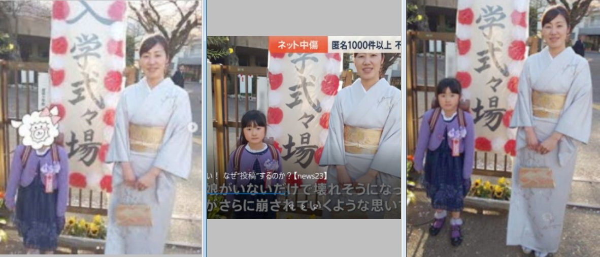 小倉美咲さんの入学式に小学校の校門前で撮ったらしき写真が3枚あります。真ん中の子はなで肩で服がはち切れんばかりになっています。首回りも太いです。向かって右は真ん中の子と同じ顔ですが身体は痩せています。右の肩から頬にかけて滲んだような跡があります。母親は3枚とも全く同じ姿勢です。 pic.x.com/pMk4YZtFIz