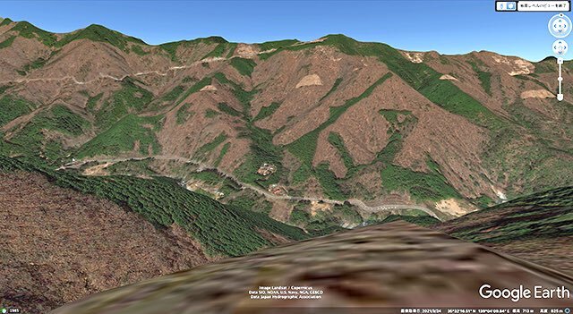 山梨のキャンプ場で行方不明になって遺骨が見つかった小倉美咲ちゃんが滑落したと見られる涸れ沢の最上部からの眺望(Google Earth) おそらく街の灯りや行き交う車のヘッドライトが見えたんだ。 pic.x.com/91Ph0v3Edn