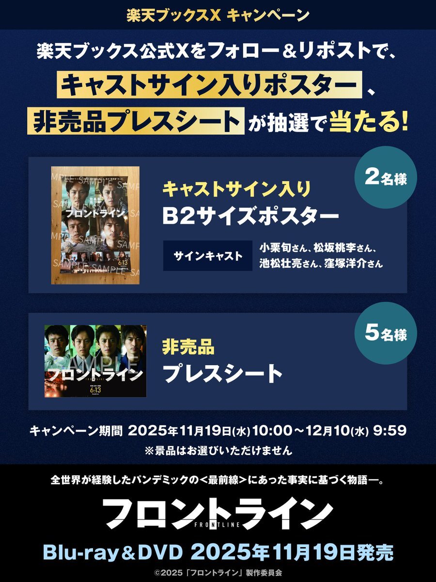 🎉本日11/19(水) Blu-ray&DVD発売🎉 『#映画フロントライン』キャンペーン‼️ 【プレゼント】 ✅サイン入りB2サイズポスター 2名様 ✨#小栗旬 さん、#松坂桃李 さん、#池松壮亮 さん、#窪塚洋介 さんのサイン入り! ✅非売品プレスシート 5名様 【応募方法】 1️⃣@rakutenbooksをフォロー pic.x.com/0DpN6qPas6