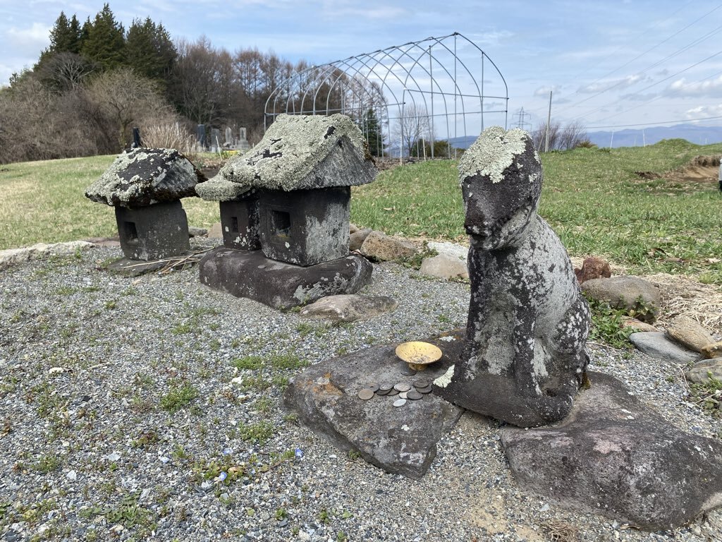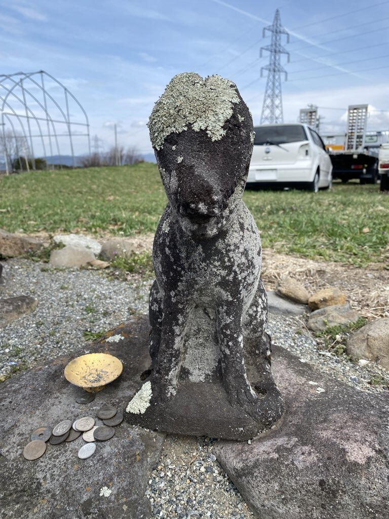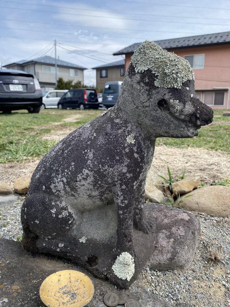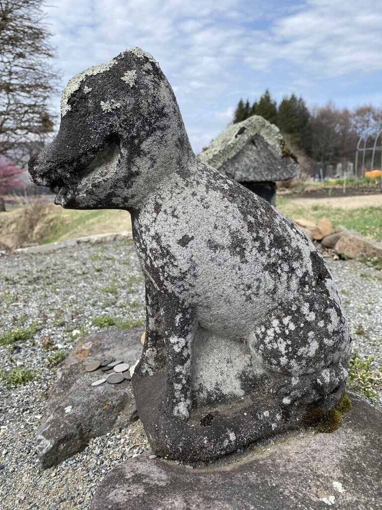 石造犬座像(諏訪郡原村) 3基の祝神石祠と並ぶ小さな犬の石像。オオカミを模ったものとされる。この像にまつわる話は知らないが、近くの「お鍬の森」に安置される同型の犬像には、小正月に獅子頭を被った子供たちが集落のシモから家々を巡り、悪魔を追い上げて犬像に喰わせる風習があるという pic.x.com/qsrPq3qpeC