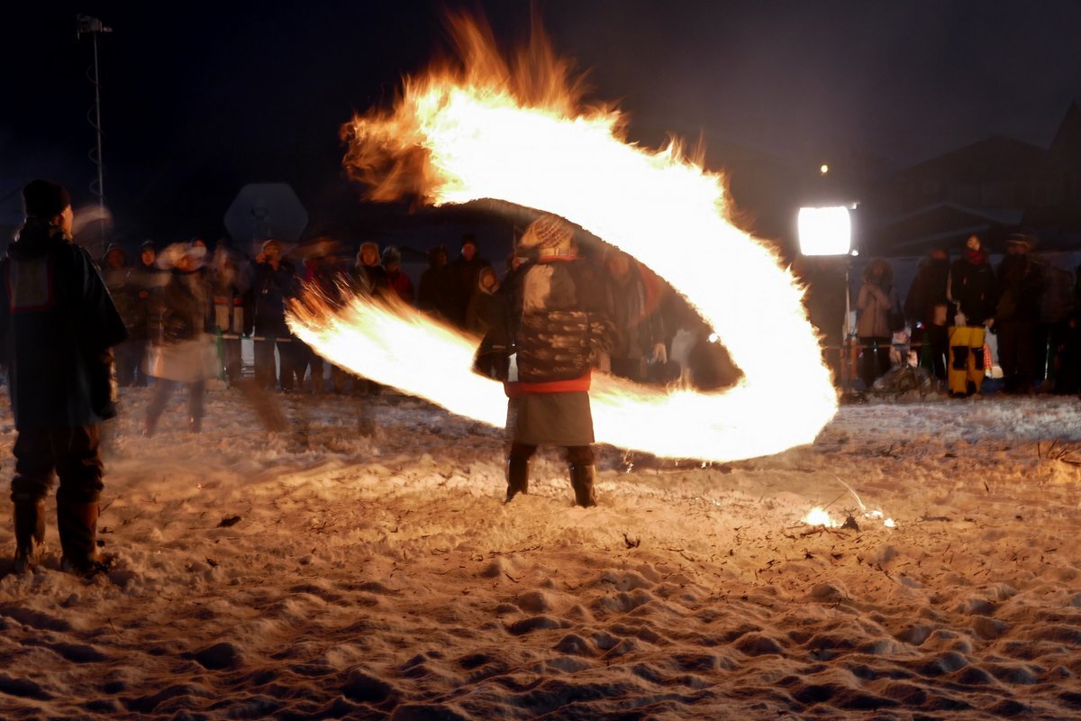 「火振りカマクラ」は仙北市角館の小正月行事だよっ 縄の先にむすびつけた炭俵に火をつけておおきくふりまわすことで、田んぼの厄をはらい無病息災・家内安全を願う行事なんだよっ 炭俵の火の粉を受けるとその年はカゼをひかないっていわれてるよ! pic.x.com/FPr4hbJJhD